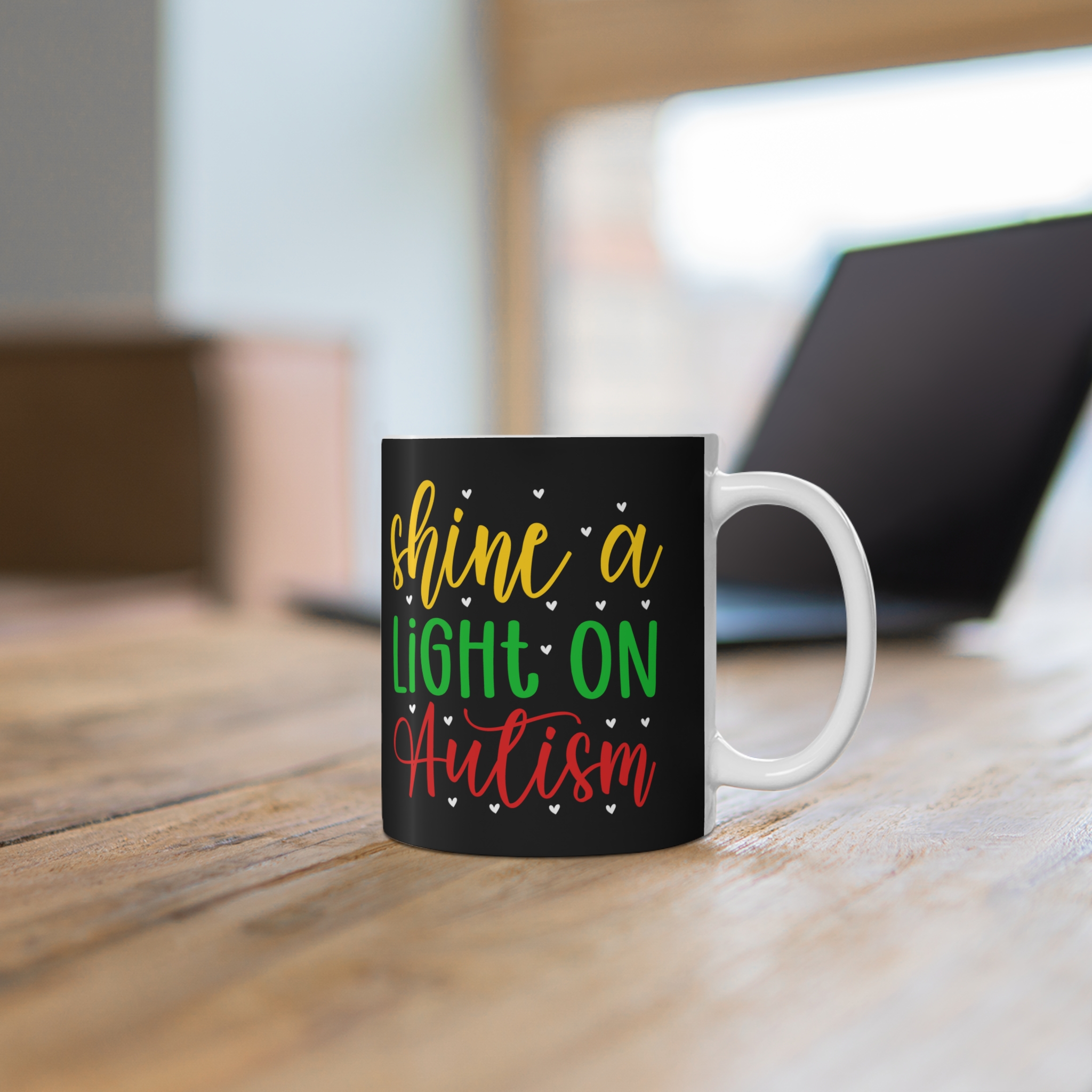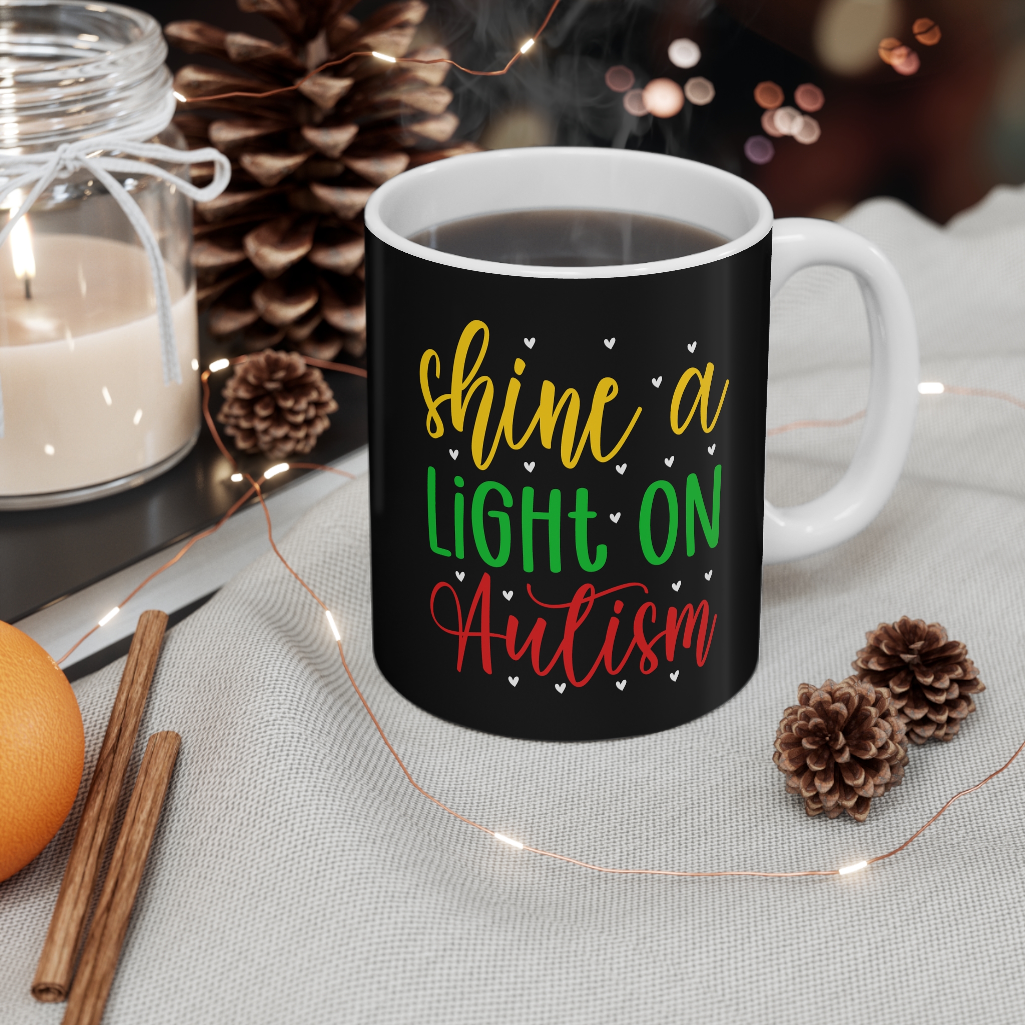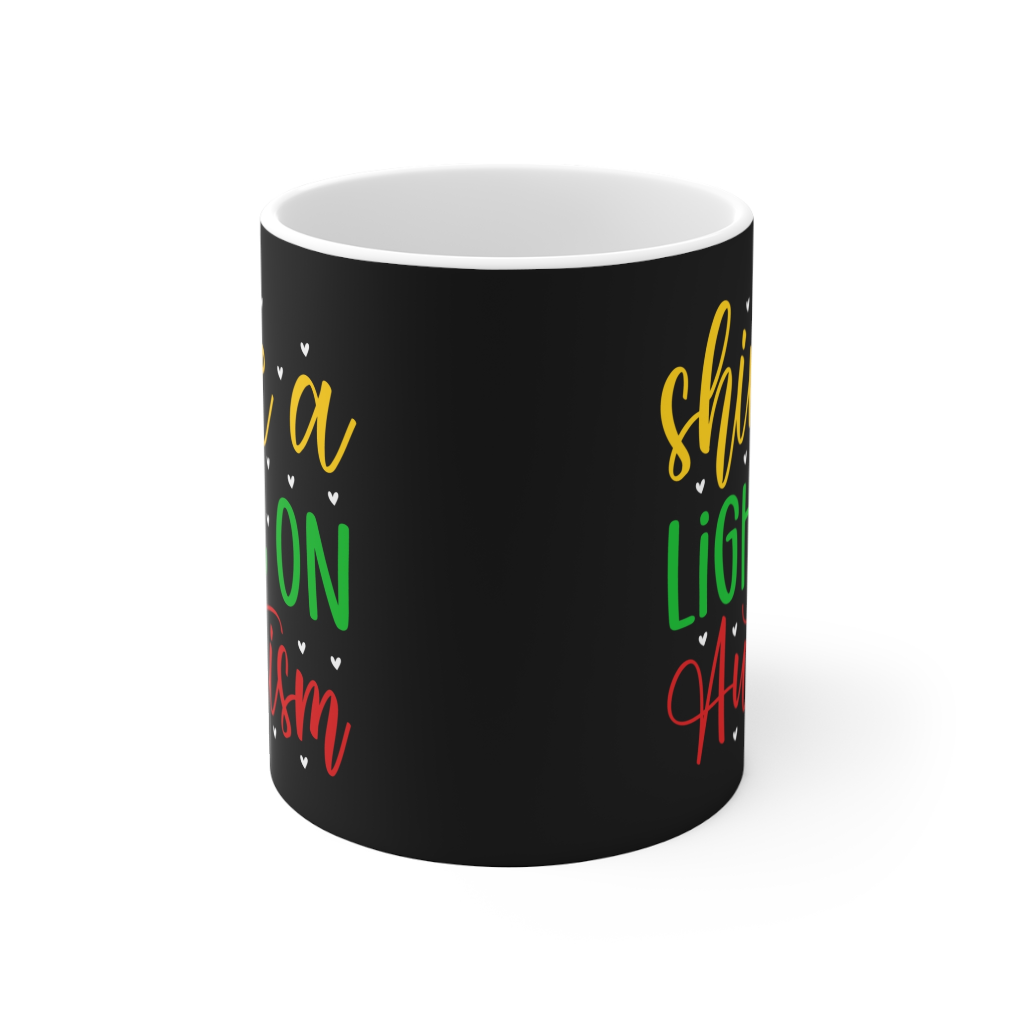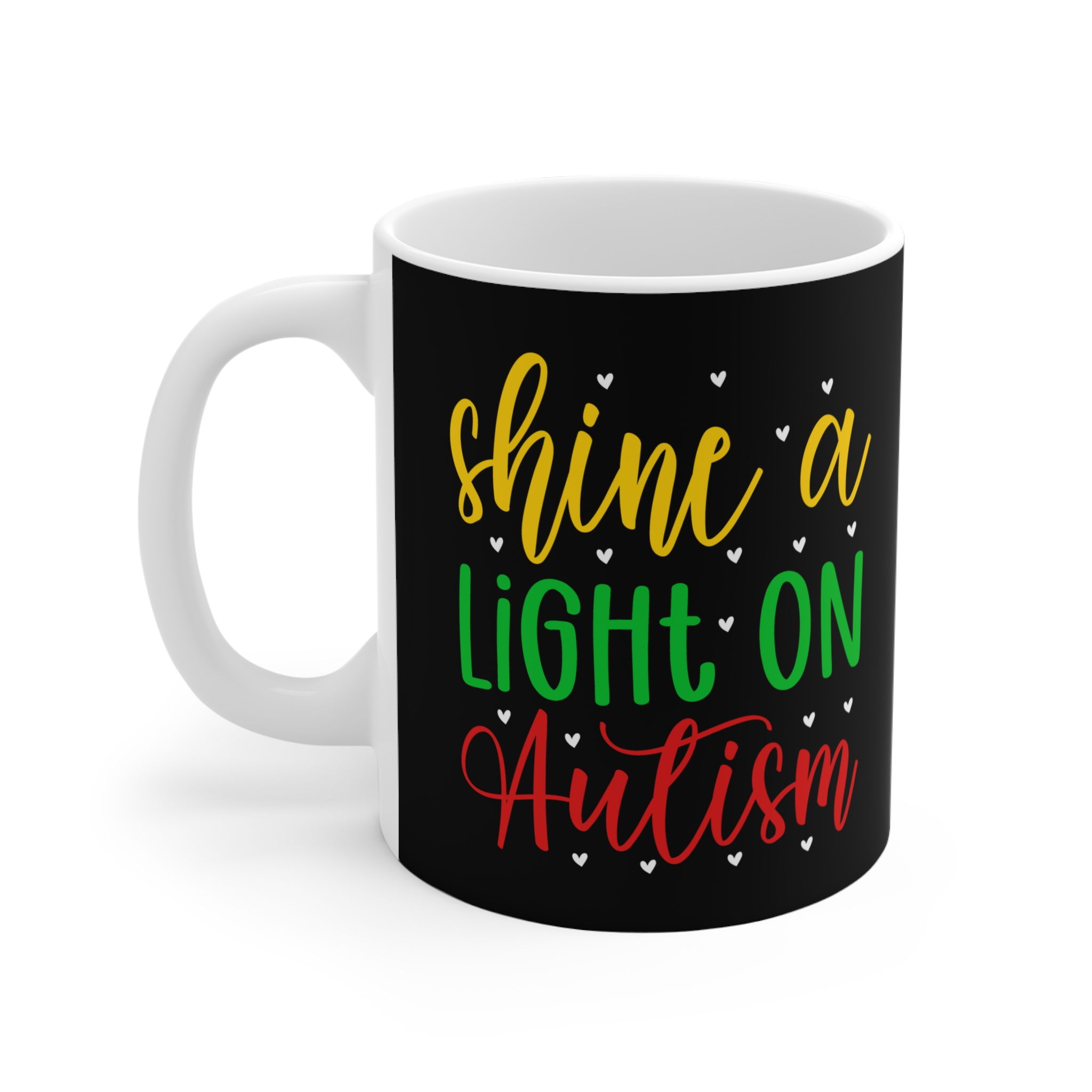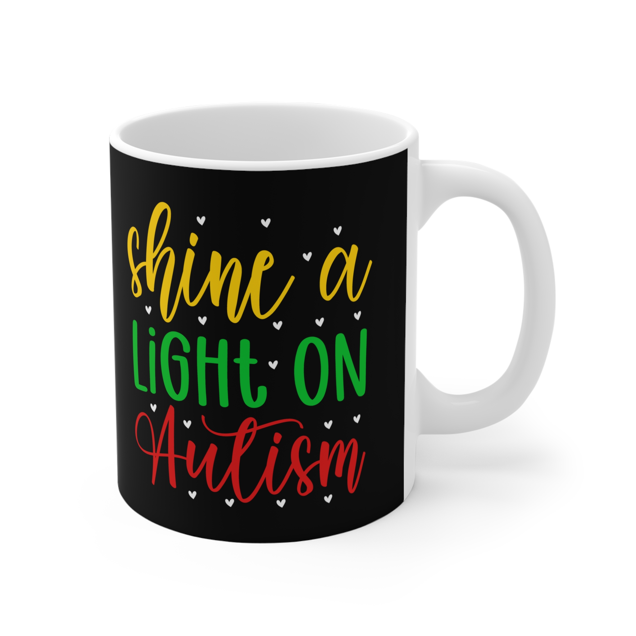 Warm, hopeful, and quietly bold — this 11oz ceramic mug carries a message that matters. Against a deep black backdrop, cheerful hand-lettering in yellow, green, and red reads “shine a LIGHT ON Autism,” dotted with tiny hearts. It’s the kind of cup you reach for on reflective mornings, during community meetings, or while writing notes to a loved one. Comfortable to hold, the C-handle and rounded rim make each sip feel familiar and steady. Whether used at a desk, kitchen table, or in a quiet corner, it’s a small, daily gesture of support and visibility for neurodiversity.