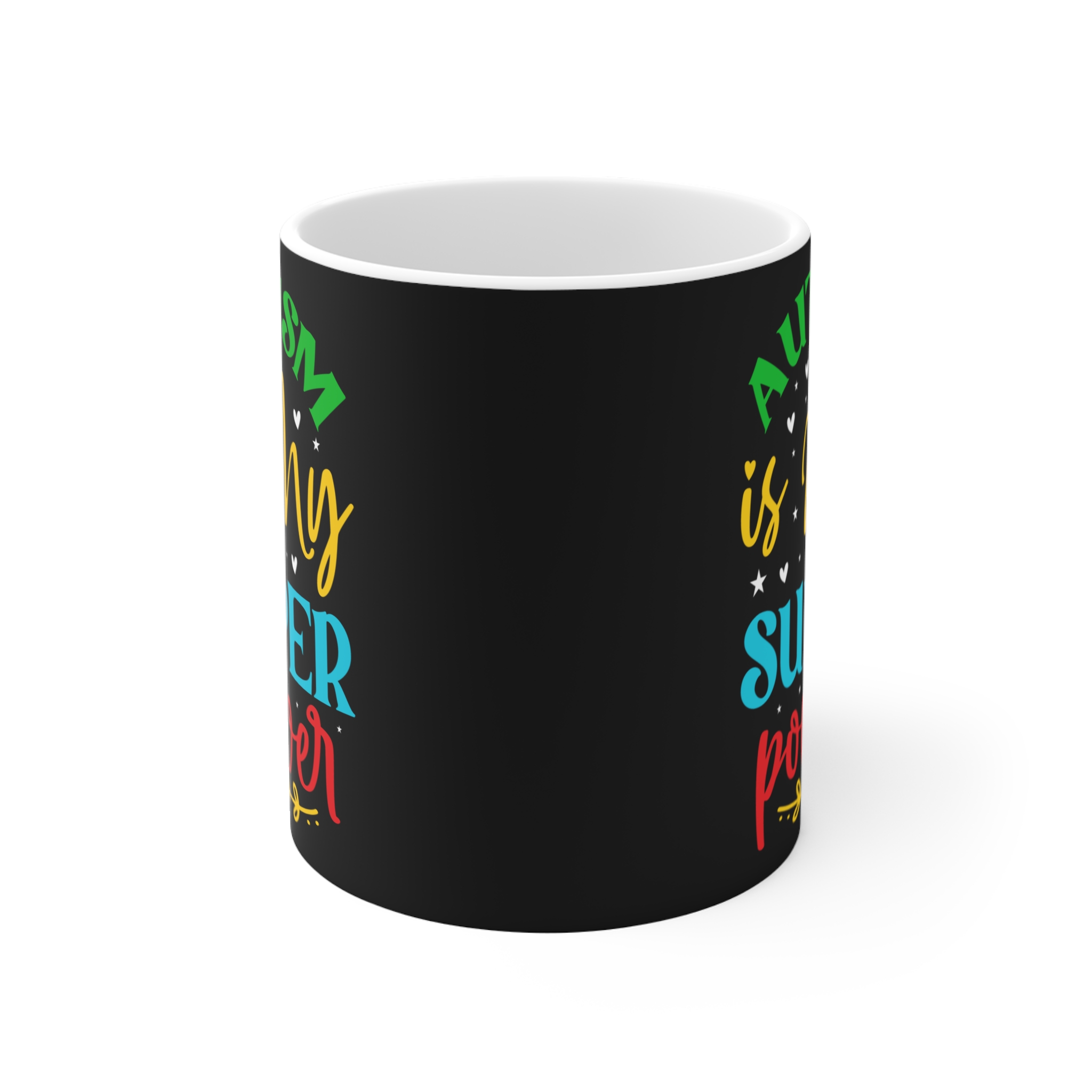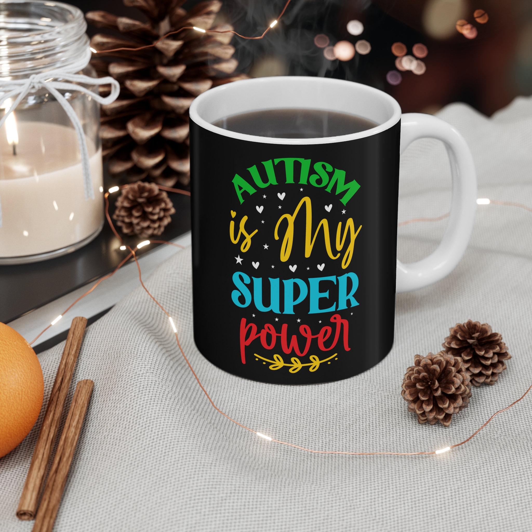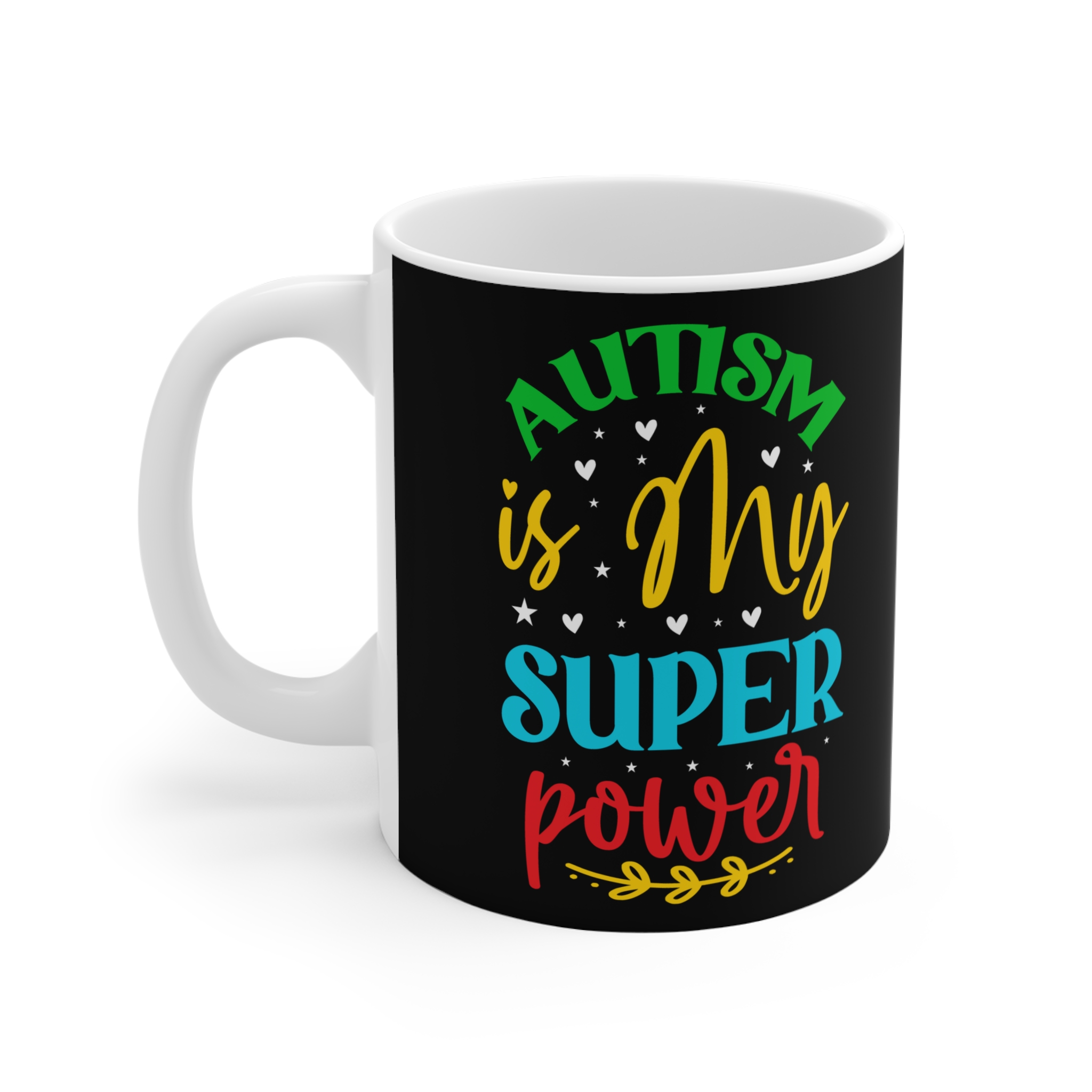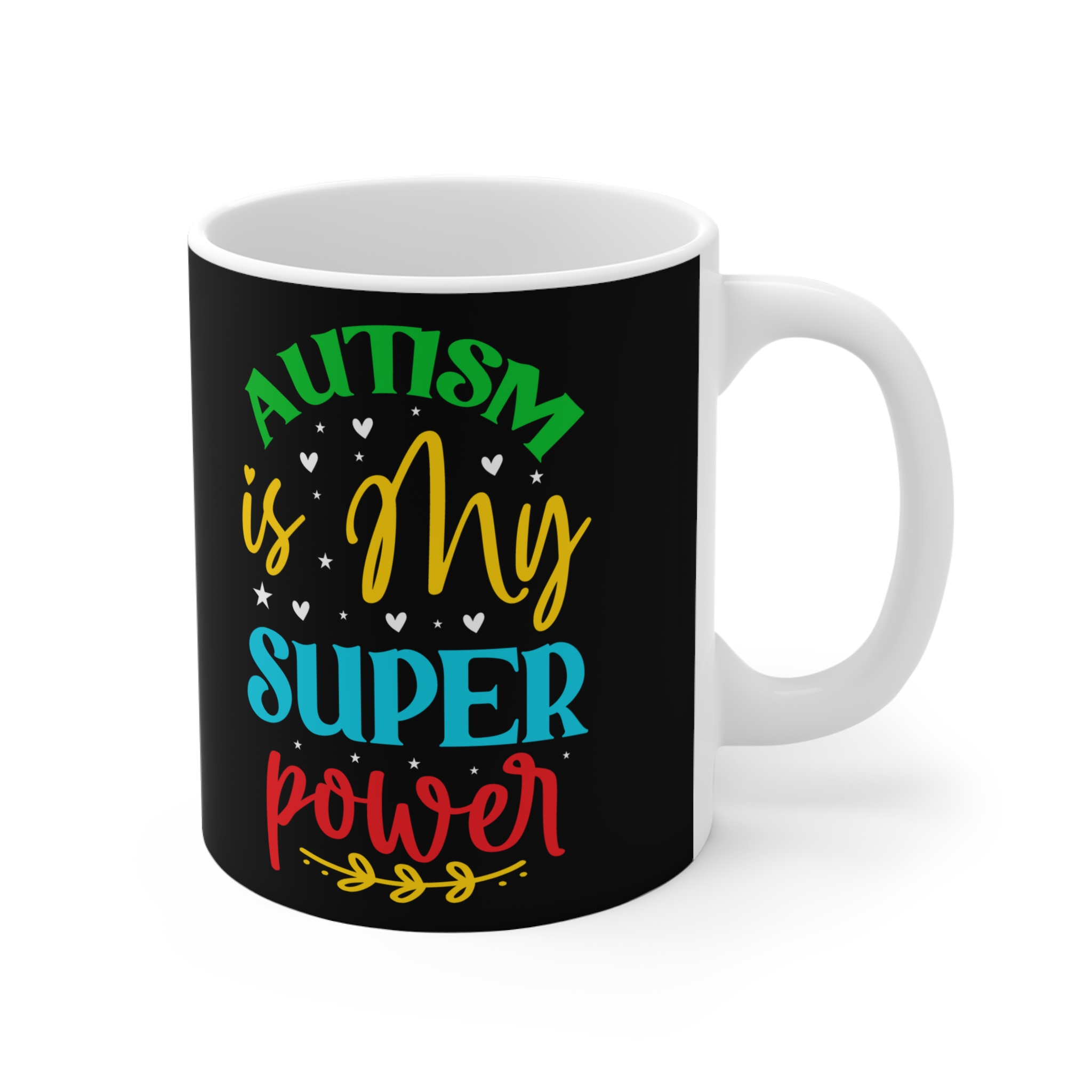 This bright, 11oz ceramic mug carries a bold declaration: “Autism is my super power.” The colorful hand-lettered design pops against a deep black background, turning an everyday cup into a quiet statement of pride and identity. It feels warm in your hands, with a comfortable C-handle and gently rounded edges. Use it for morning coffee, afternoon tea, or as a small desktop reminder of strength and uniqueness. The cheerful lettering and tiny heart accents create a hopeful, supportive mood — the kind that sparks conversations and lifts spirits during ordinary routines or community gatherings.