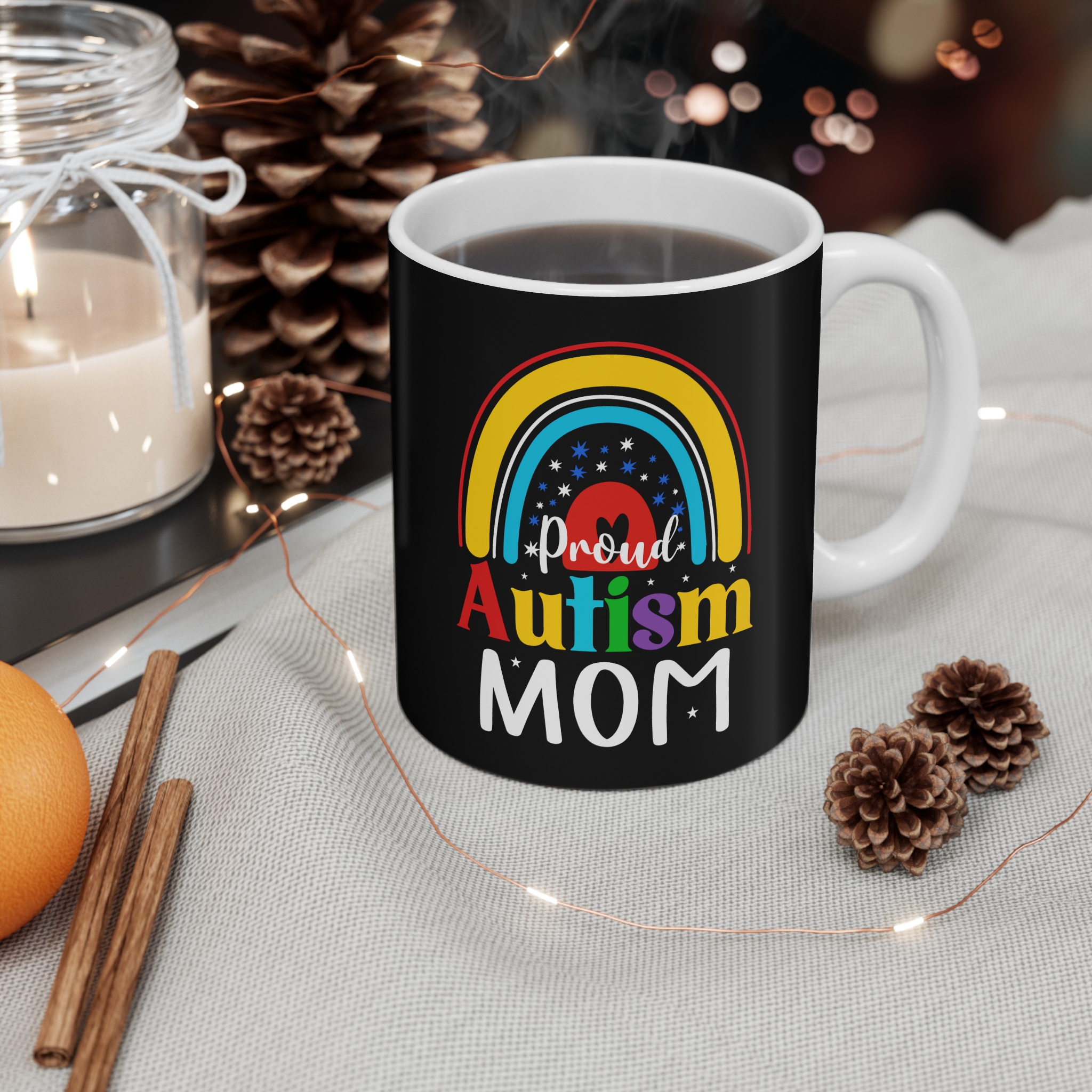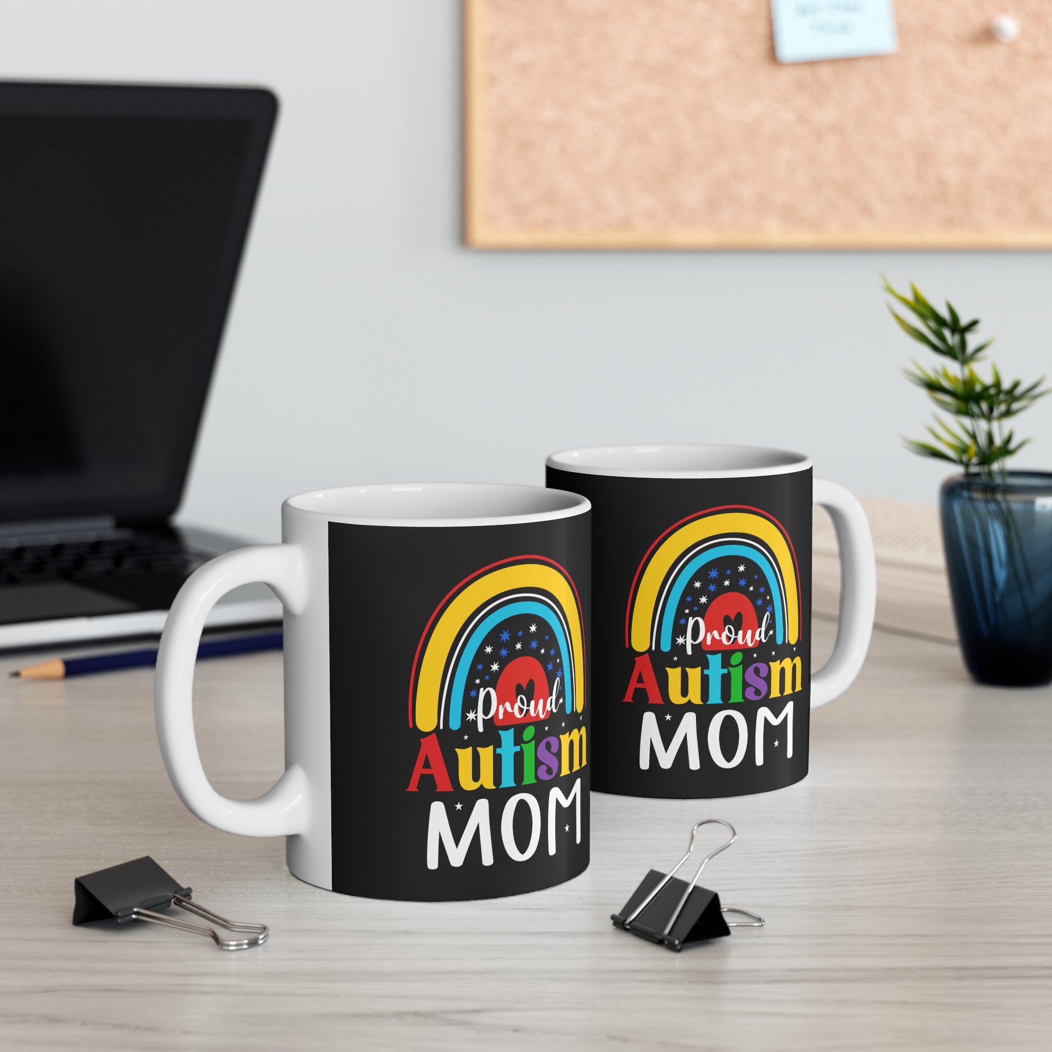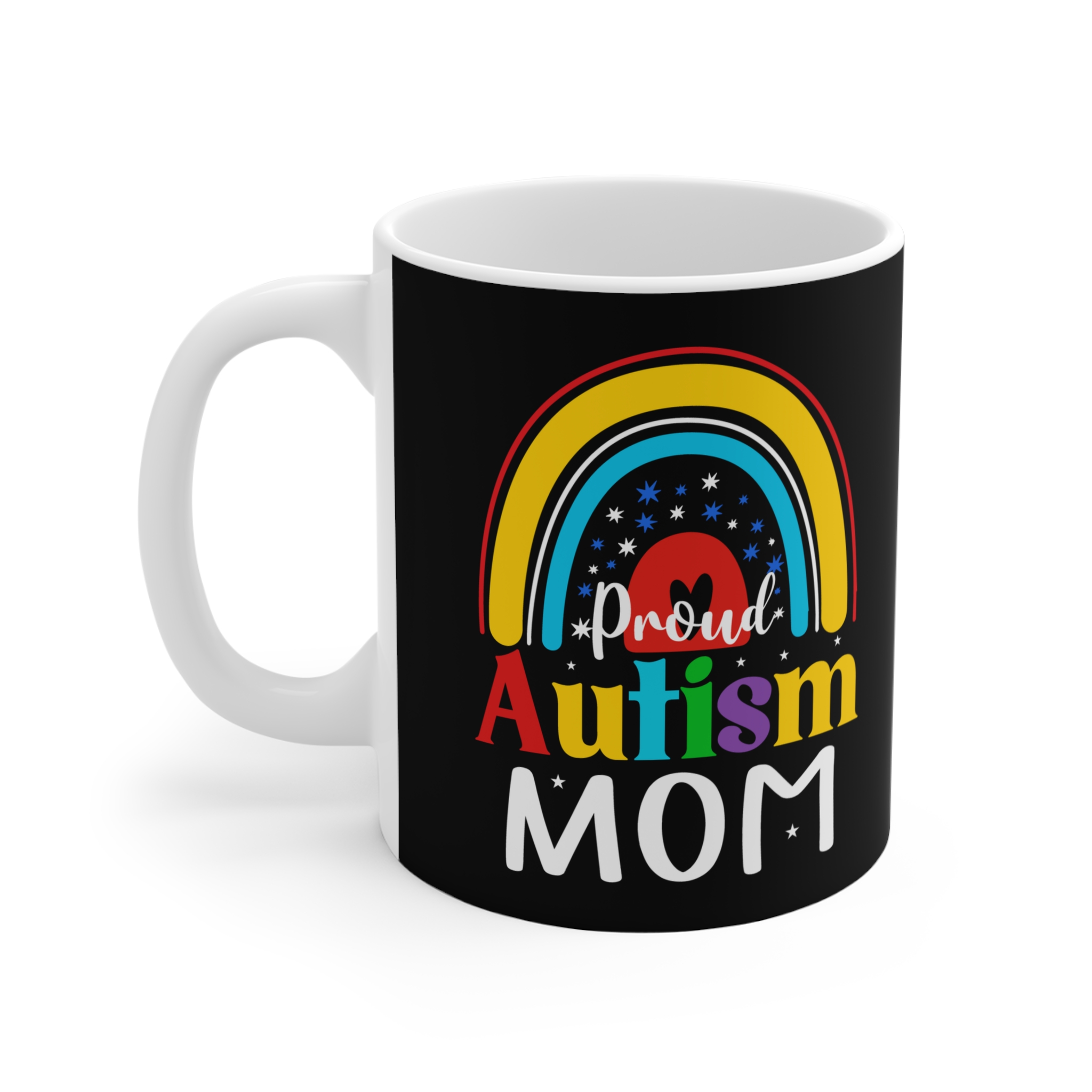 This bright ceramic mug celebrates the quiet, steady love of a mom who supports her autistic child. A colorful rainbow arches over bold, playful lettering that reads “Proud Autism Mom,” set against a deep black background that makes the design pop. It feels warm in your hands and brings a little moment of pride to morning coffee, afternoon tea, or a late-night planning session. Natural, everyday use—sipping while sorting schedules, cheering at milestones, or pausing for a breath—this mug is a small, honest reminder of connection and advocacy.