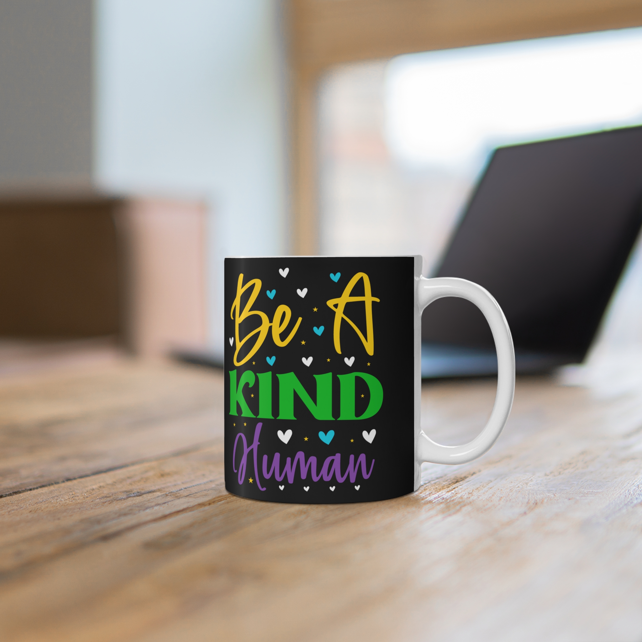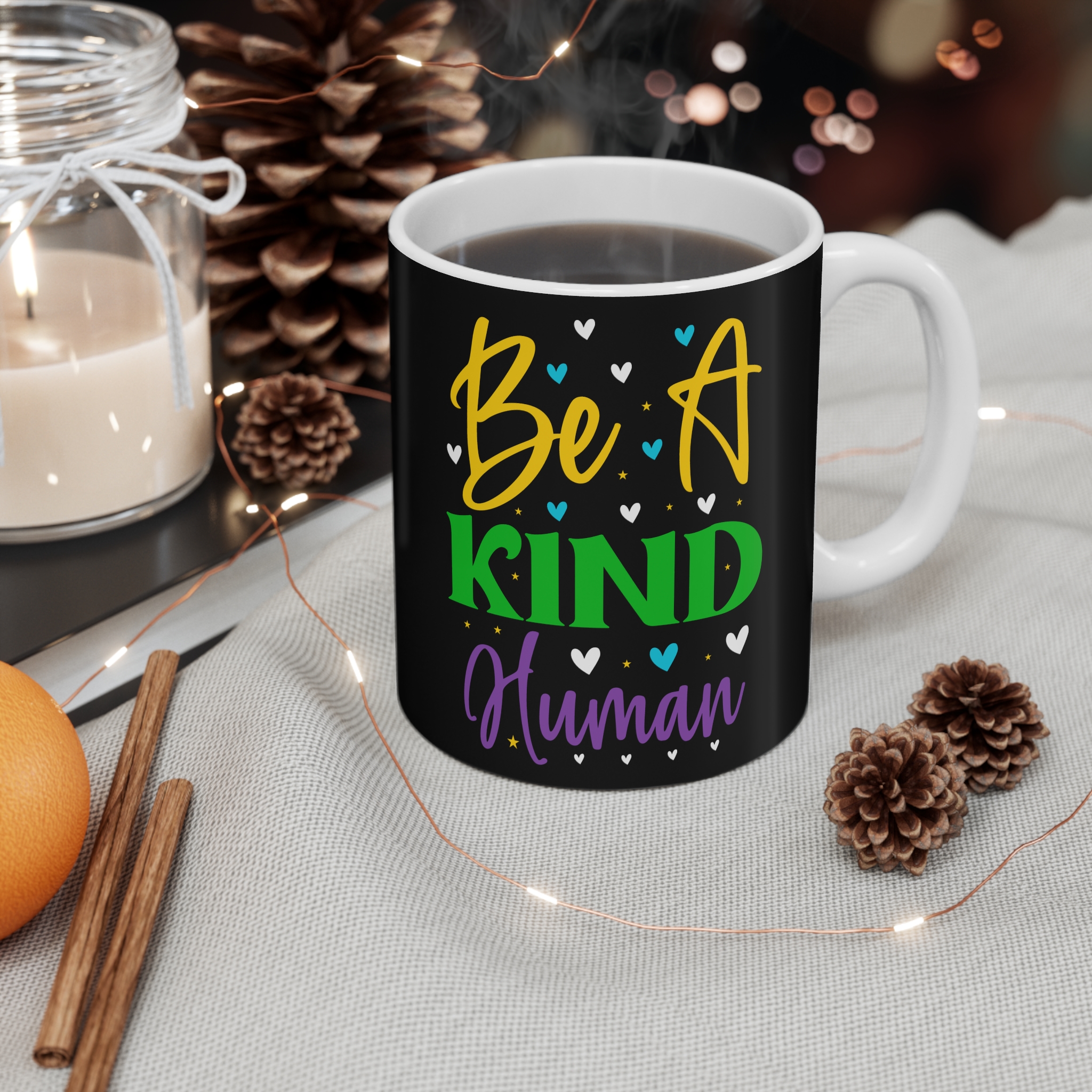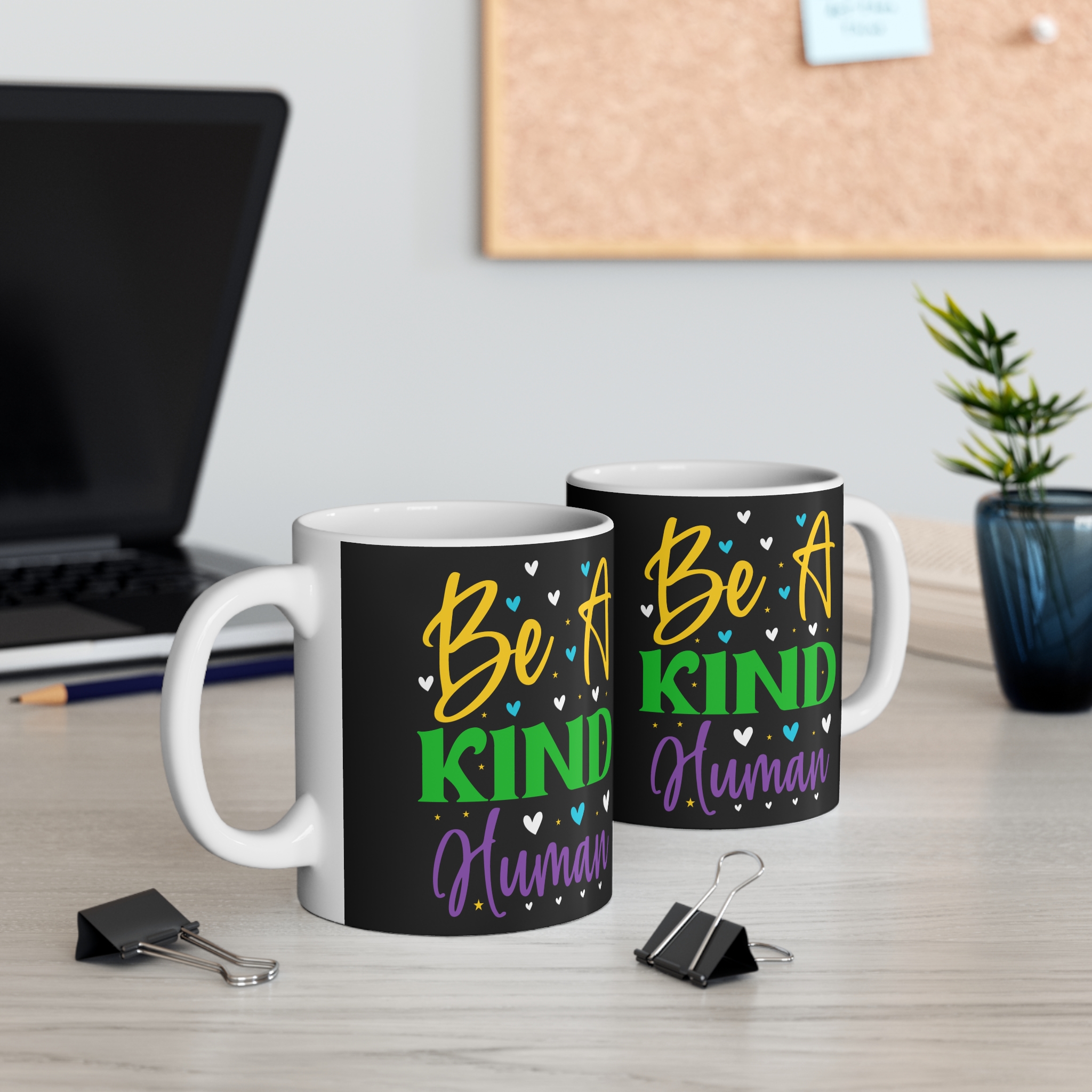This 11oz ceramic mug brings a small, steady reminder into everyday routines: be kind. Bright, hand-lettered script pops against a rich black background — sunshine yellow, fresh green and deep purple layered with tiny heart accents. It’s the kind of mug that settles warm hands and calms a hurried morning. Use it for coffee, tea, or a late-night cocoa while you regroup; the cheerful message reads like a gentle nudge to slow down and choose compassion.