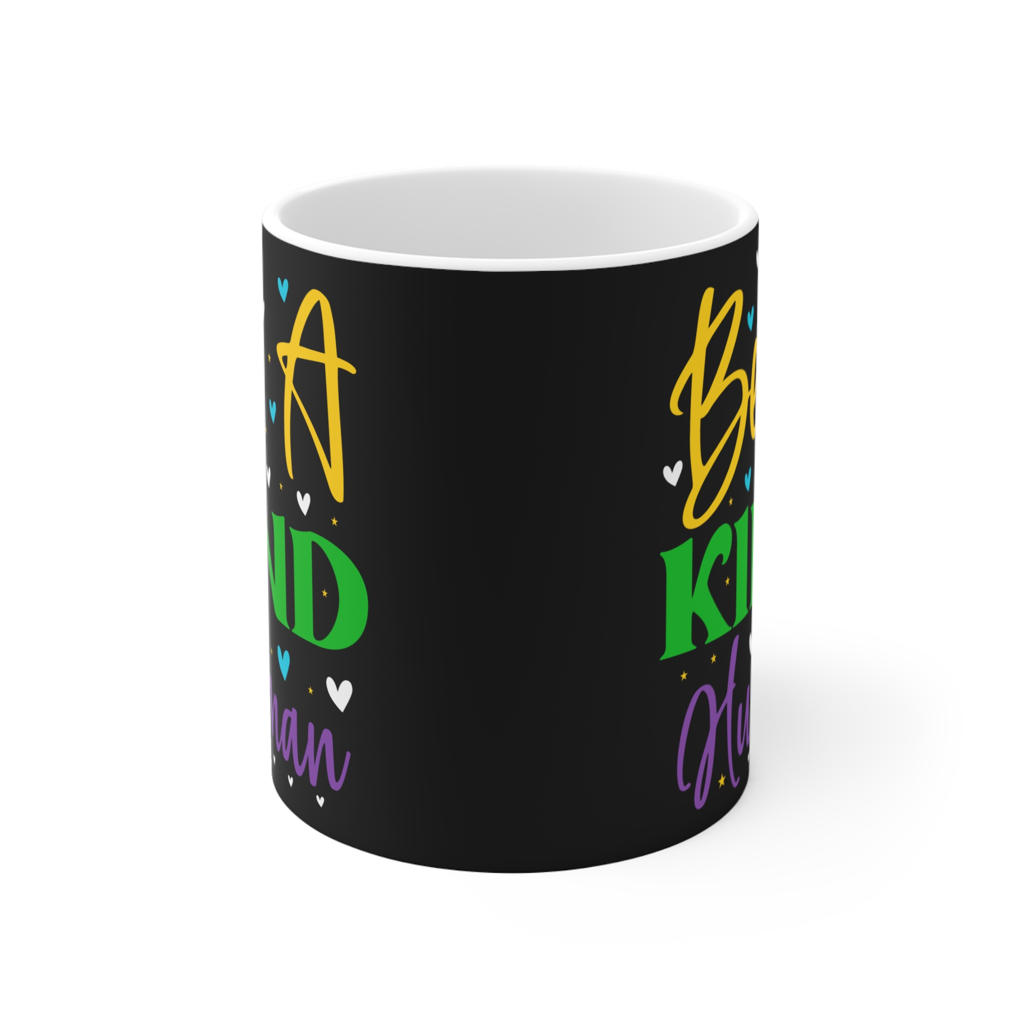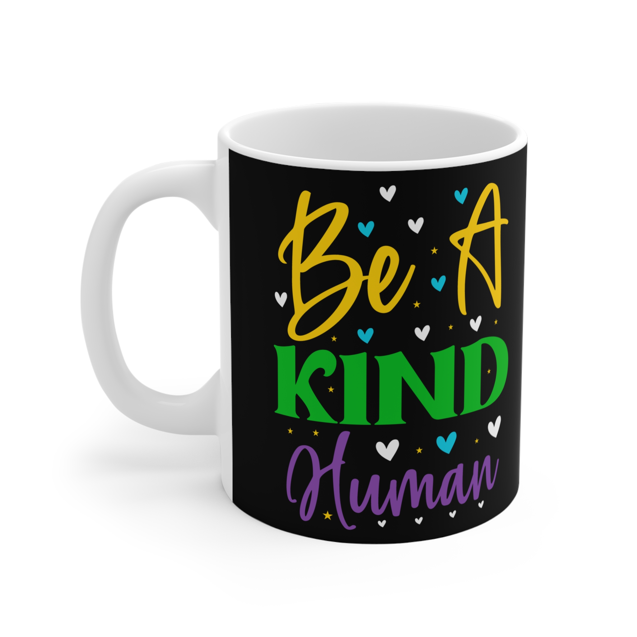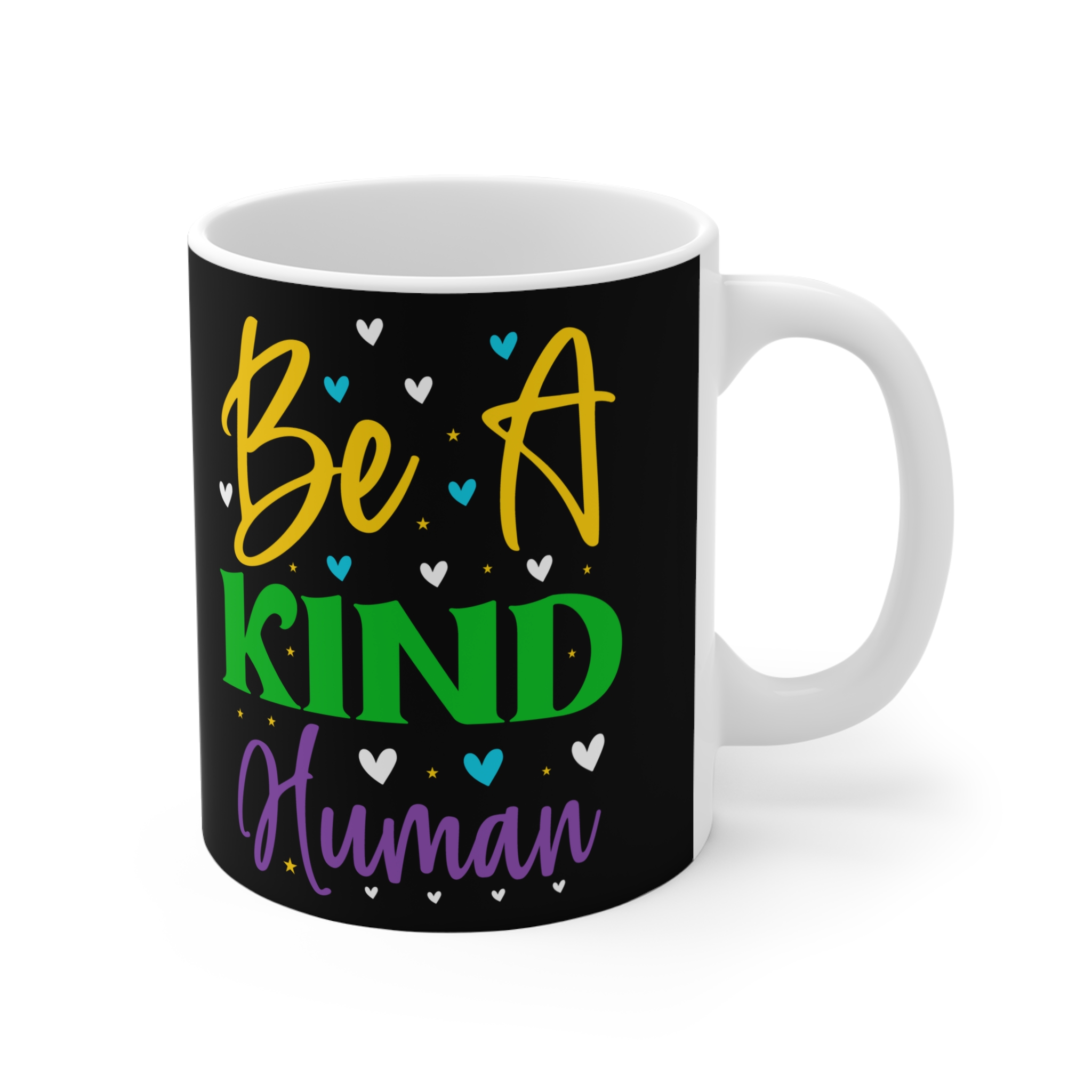 This 11oz ceramic mug brings a small, steady reminder into everyday routines: be kind. Bright, hand-lettered script pops against a rich black background — sunshine yellow, fresh green and deep purple layered with tiny heart accents. It’s the kind of mug that settles warm hands and calms a hurried morning. Use it for coffee, tea, or a late-night cocoa while you regroup; the cheerful message reads like a gentle nudge to slow down and choose compassion.