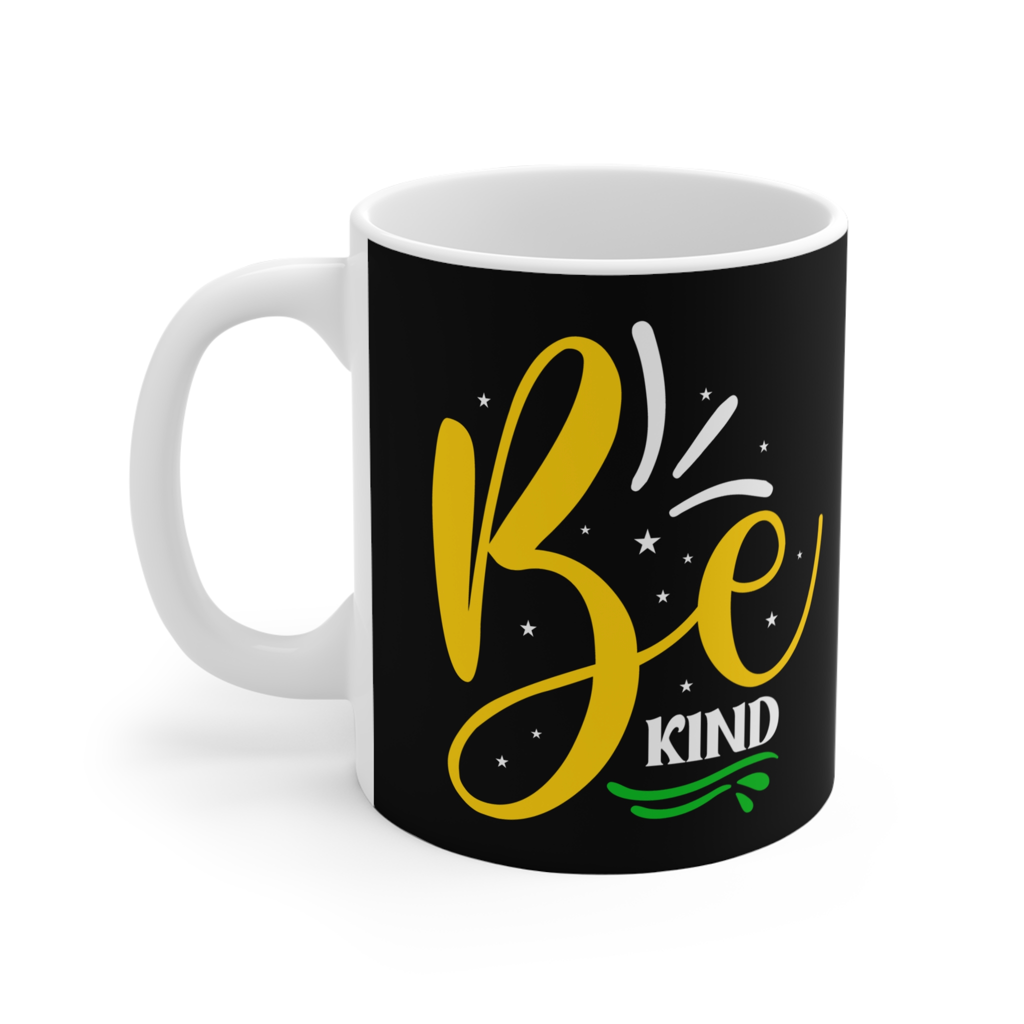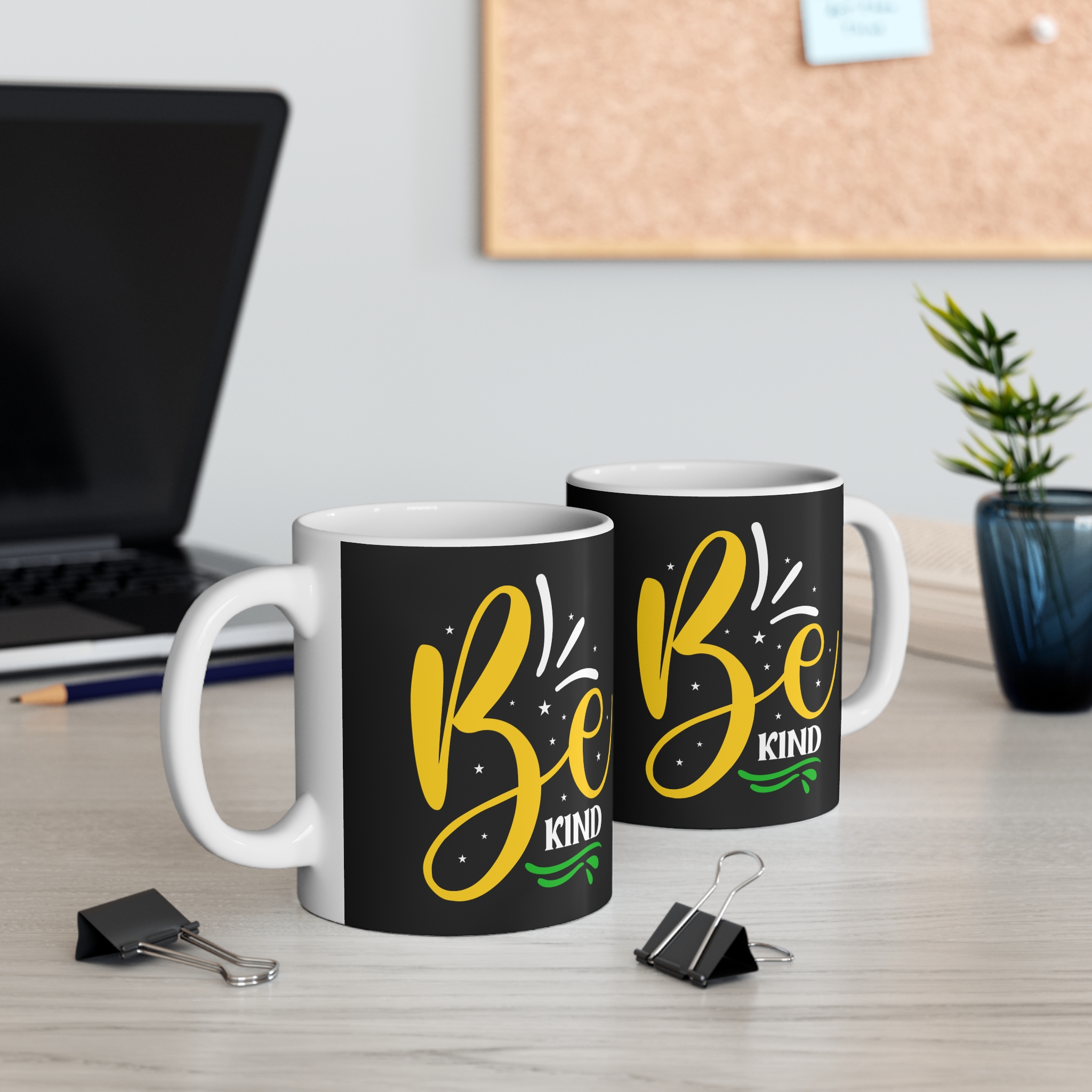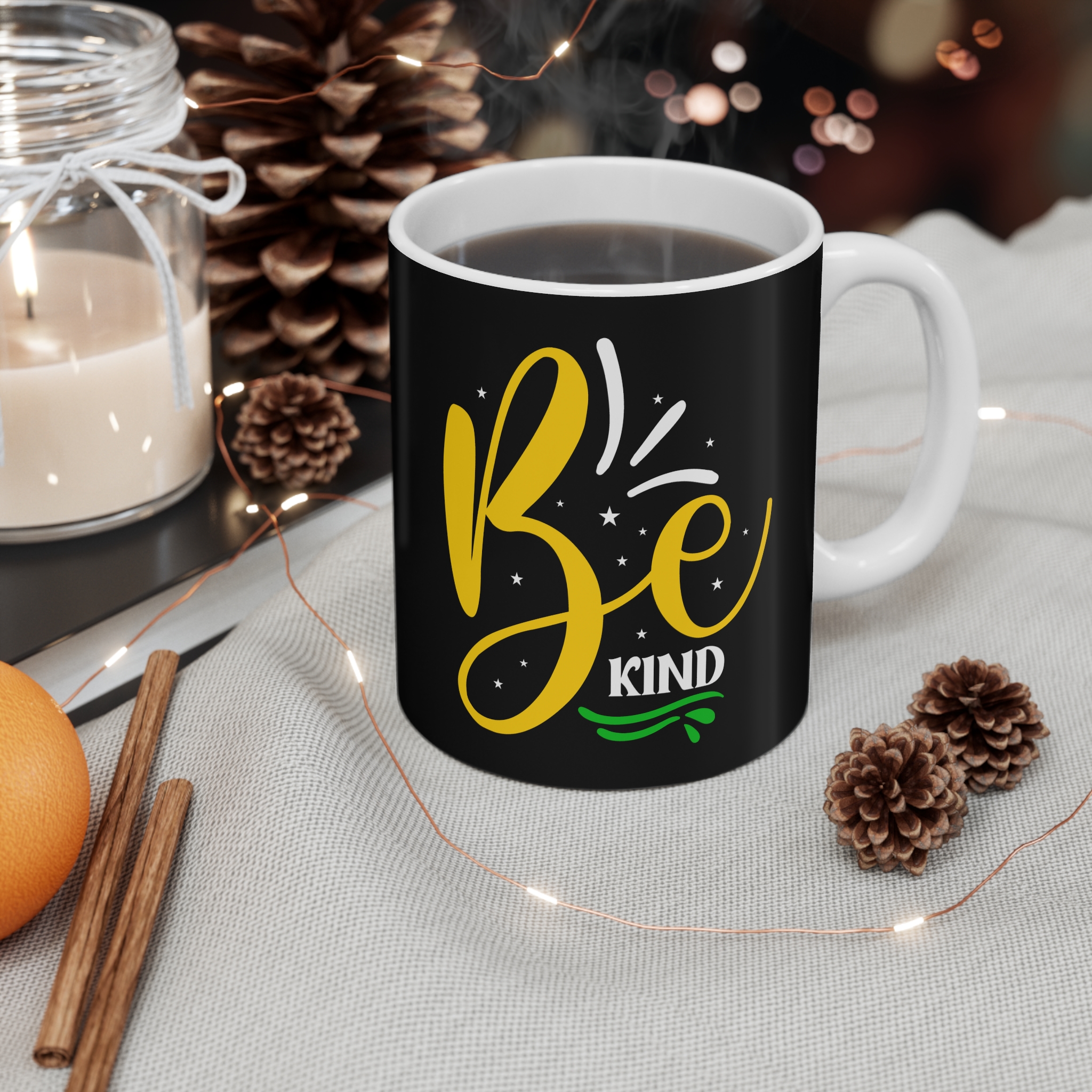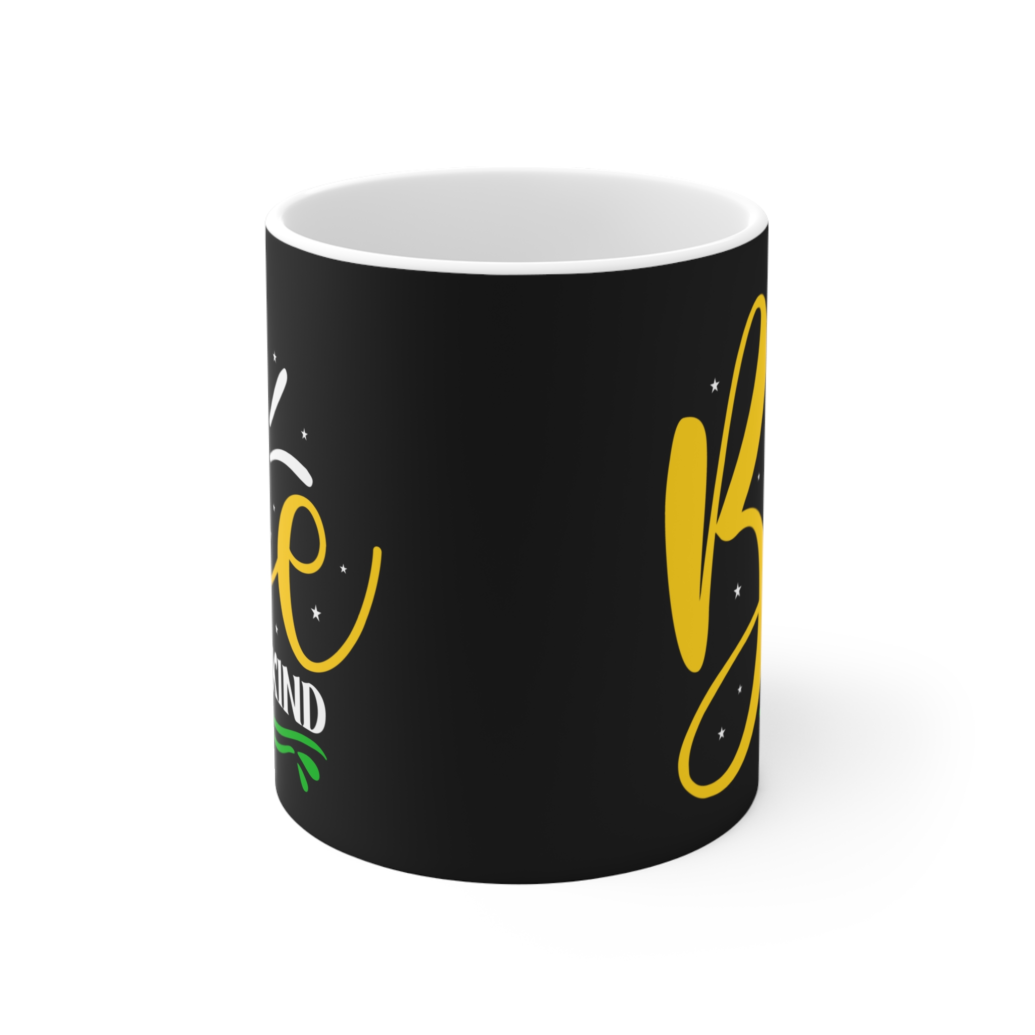 This 11oz ceramic mug brings a quiet, hopeful moment to busy mornings. The bold black wrap features warm gold lettering and small leaf accents, a gentle reminder to move through the day with kindness. It feels grounding in your hands — smooth ceramic, a comfortable C-handle, and rounded edges that soften each sip. Bright coffee, late-night tea, or a moment between meetings — this mug slips into routines and rituals, nudging calm and goodwill into ordinary hours.