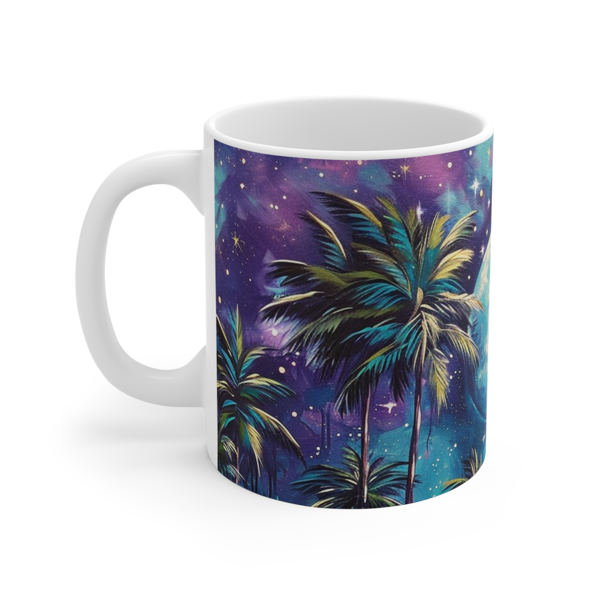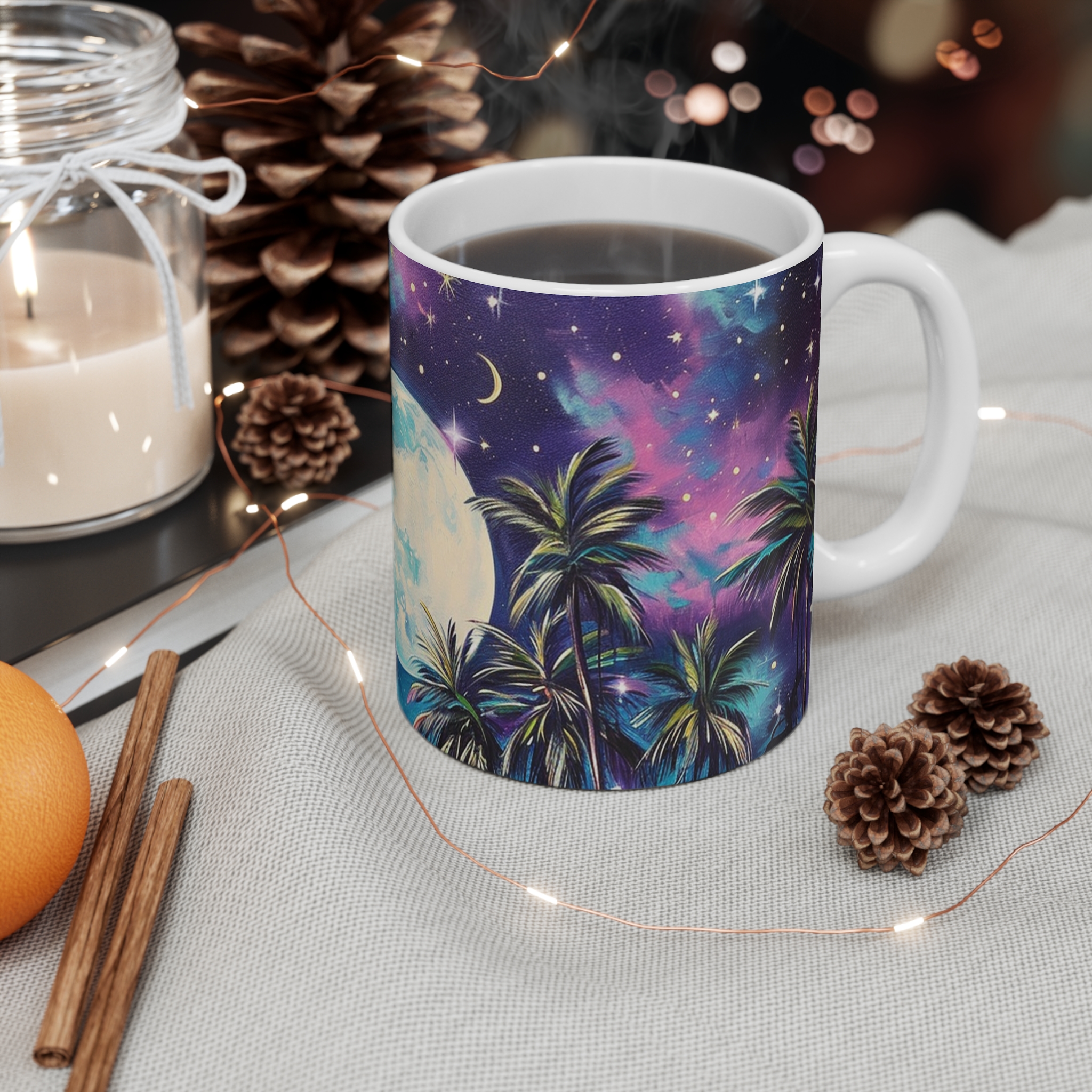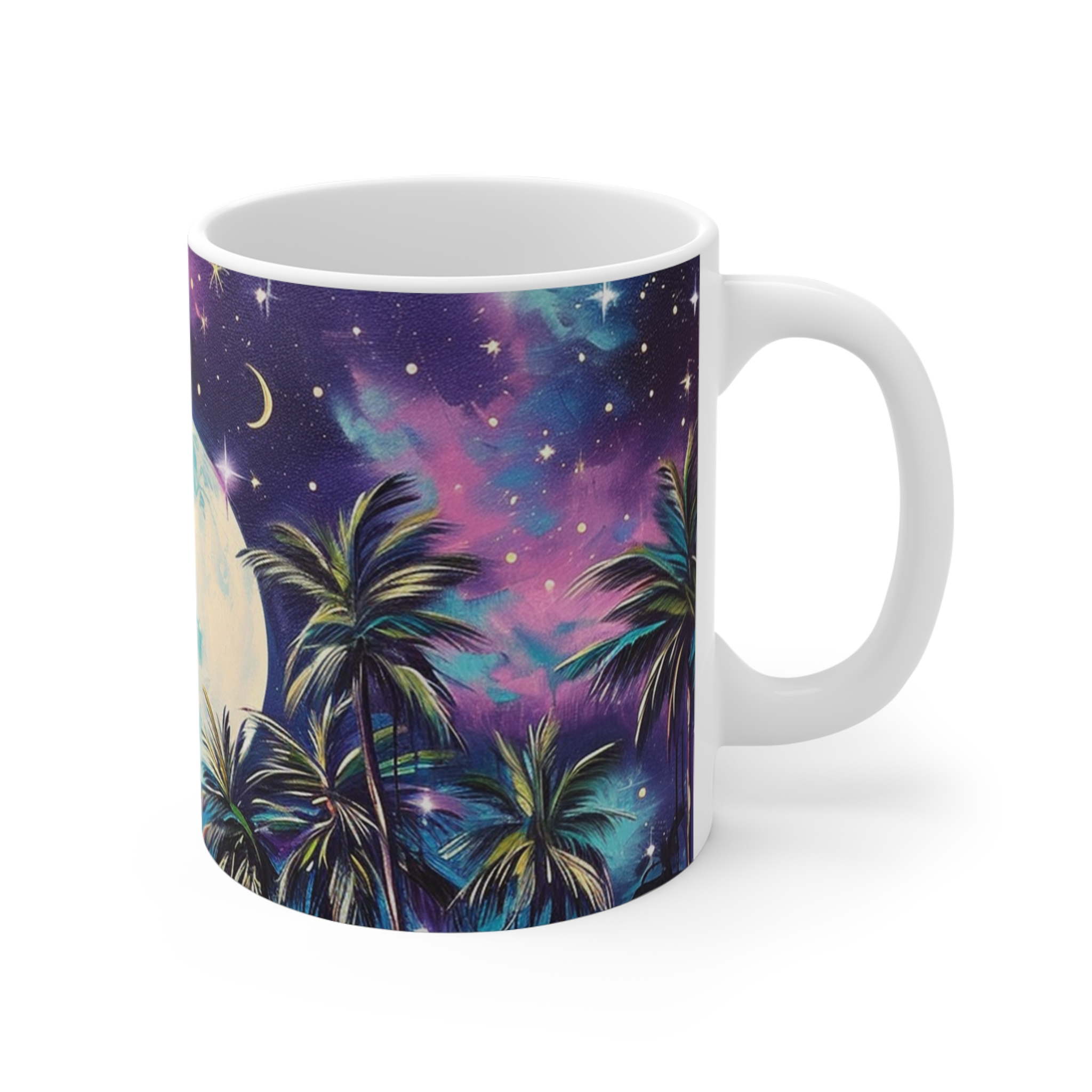 Full Moon Island Mug – 11oz Coffee Cup with Palm Trees and Galaxy Design