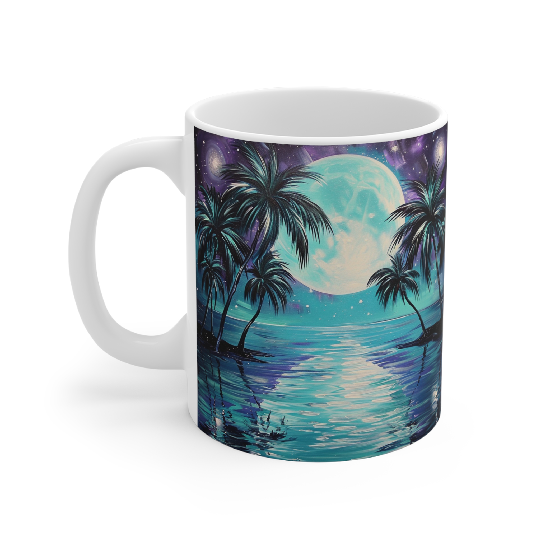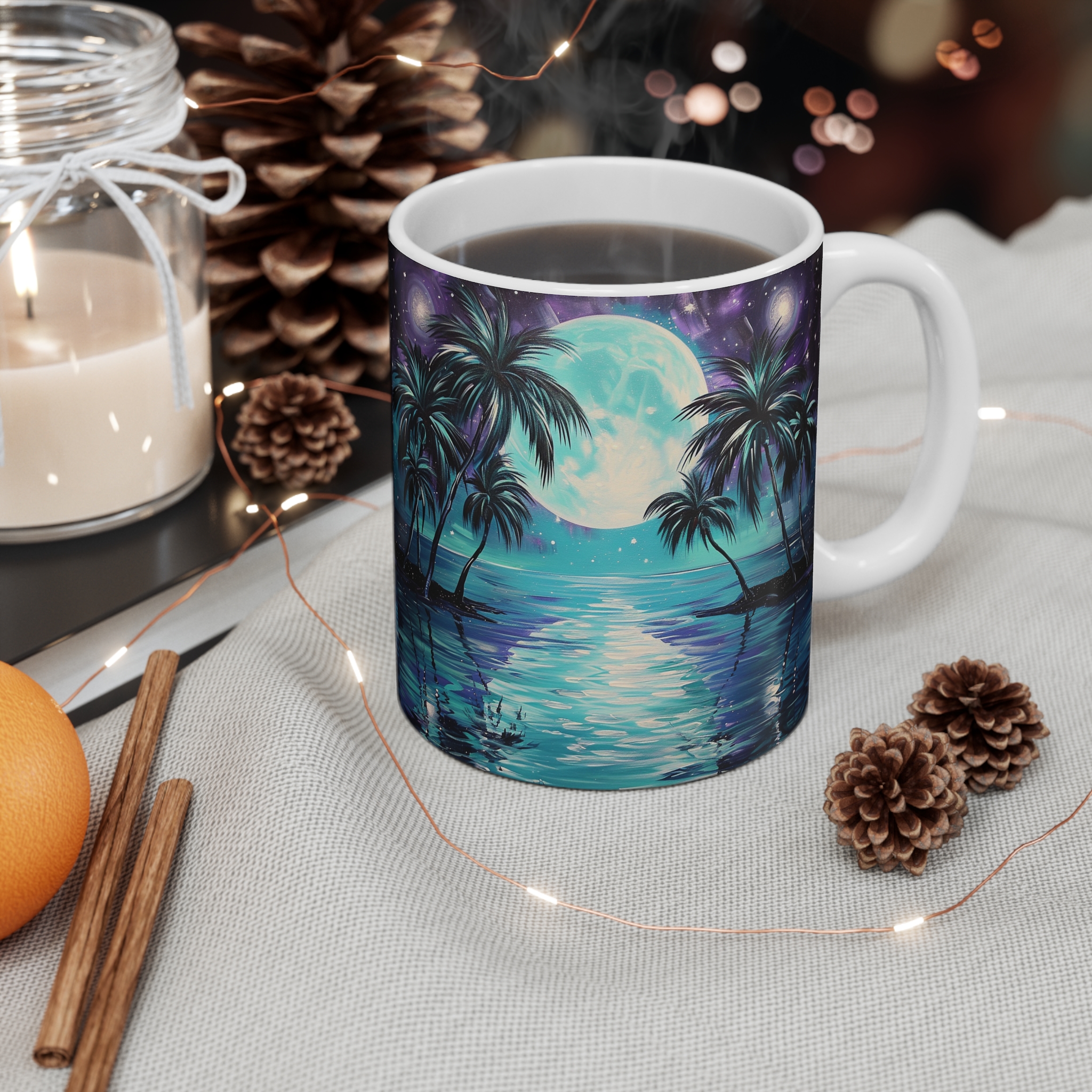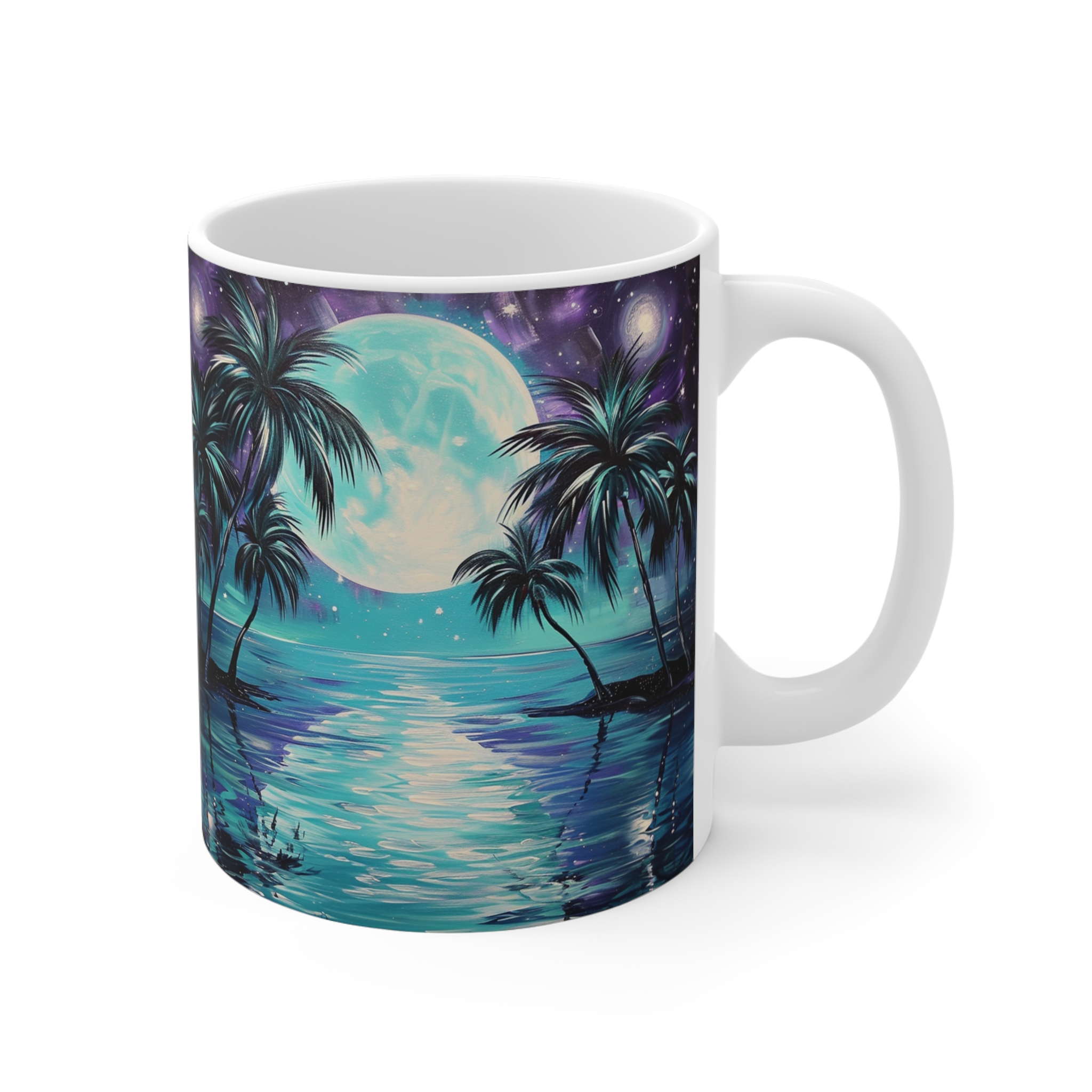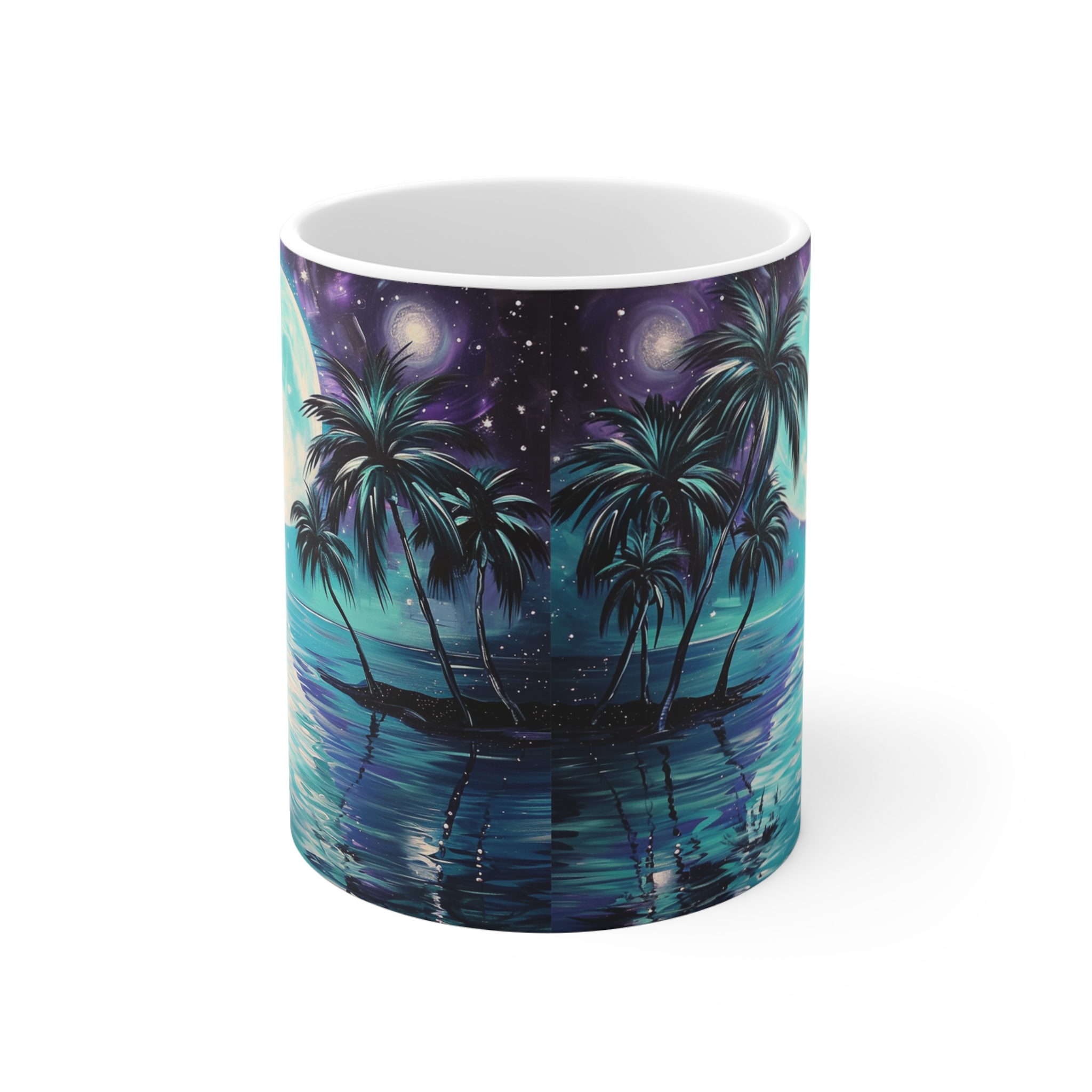 Embrace the tranquil beauty of a tropical paradise with this stunning 11oz mug. Featuring a captivating design of palm trees against a mesmerizing night sky, it’s perfect for adding a touch of serenity to your morning routine. Whether you’re sipping coffee at sunrise or enjoying tea during a cozy afternoon, this mug fosters a relaxed vibe that can enhance any moment. Ideal for nature lovers, beach enthusiasts, or anyone seeking a daily escape, this mug is a delightful gift for birthdays, anniversaries, or just because. Celebrate warm evenings and summer vibes year-round with this picturesque piece of art!
