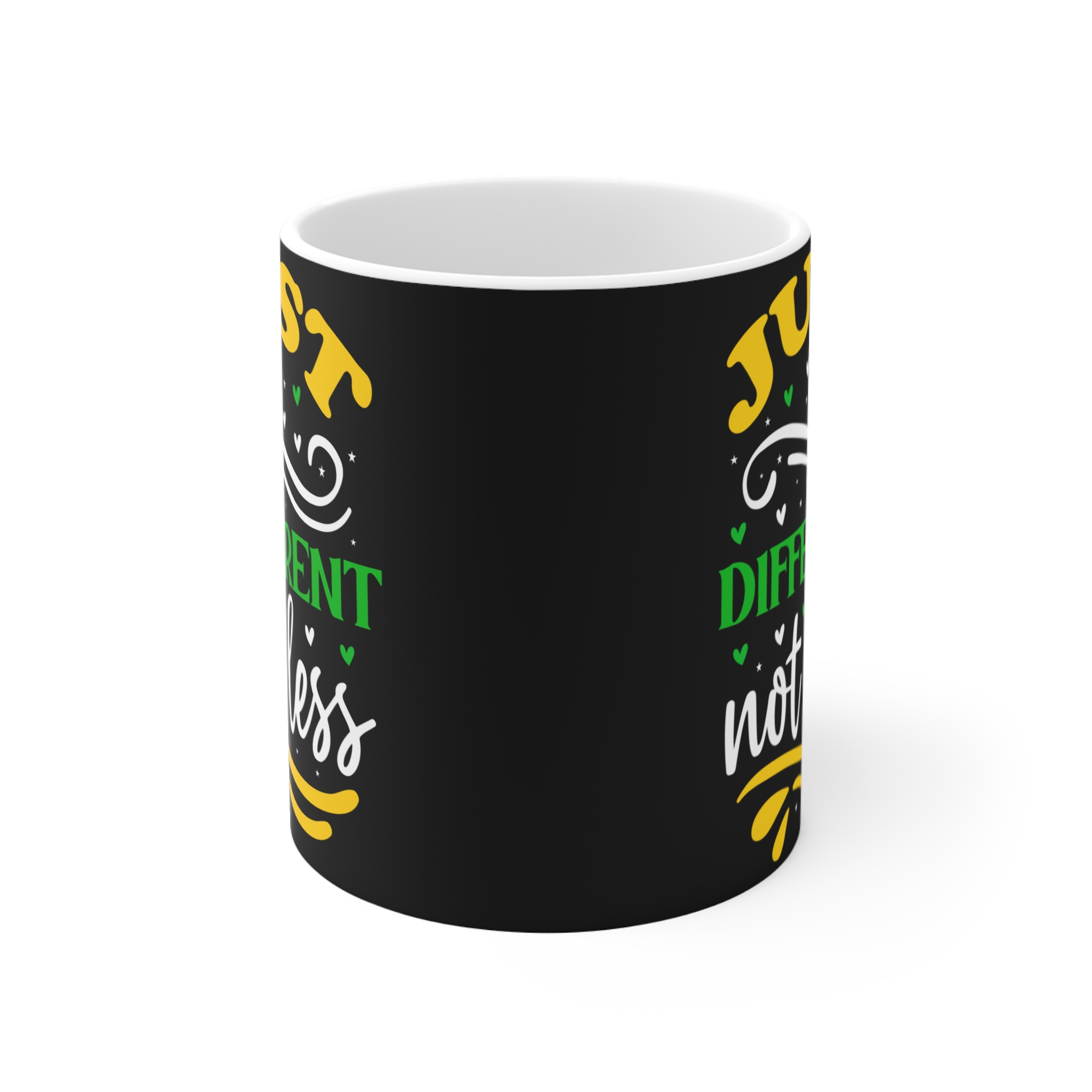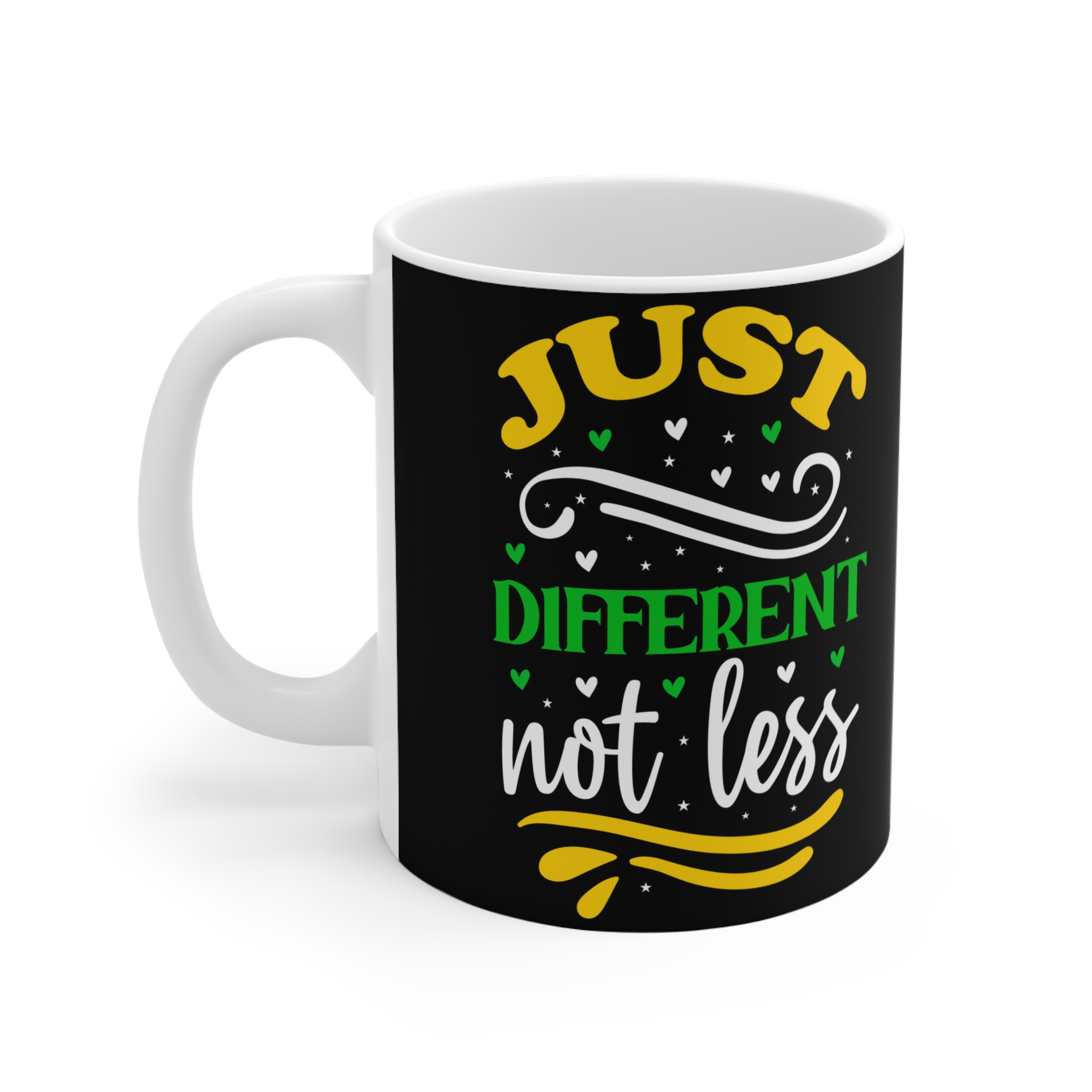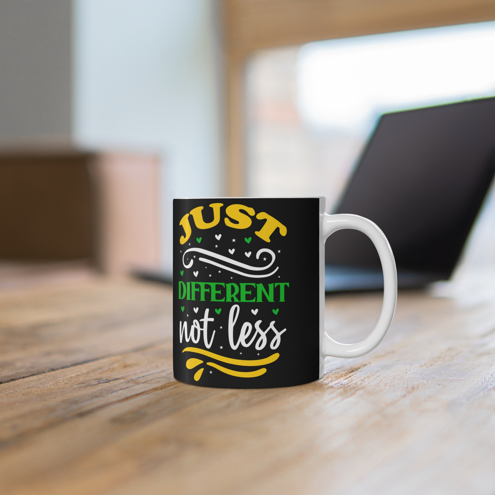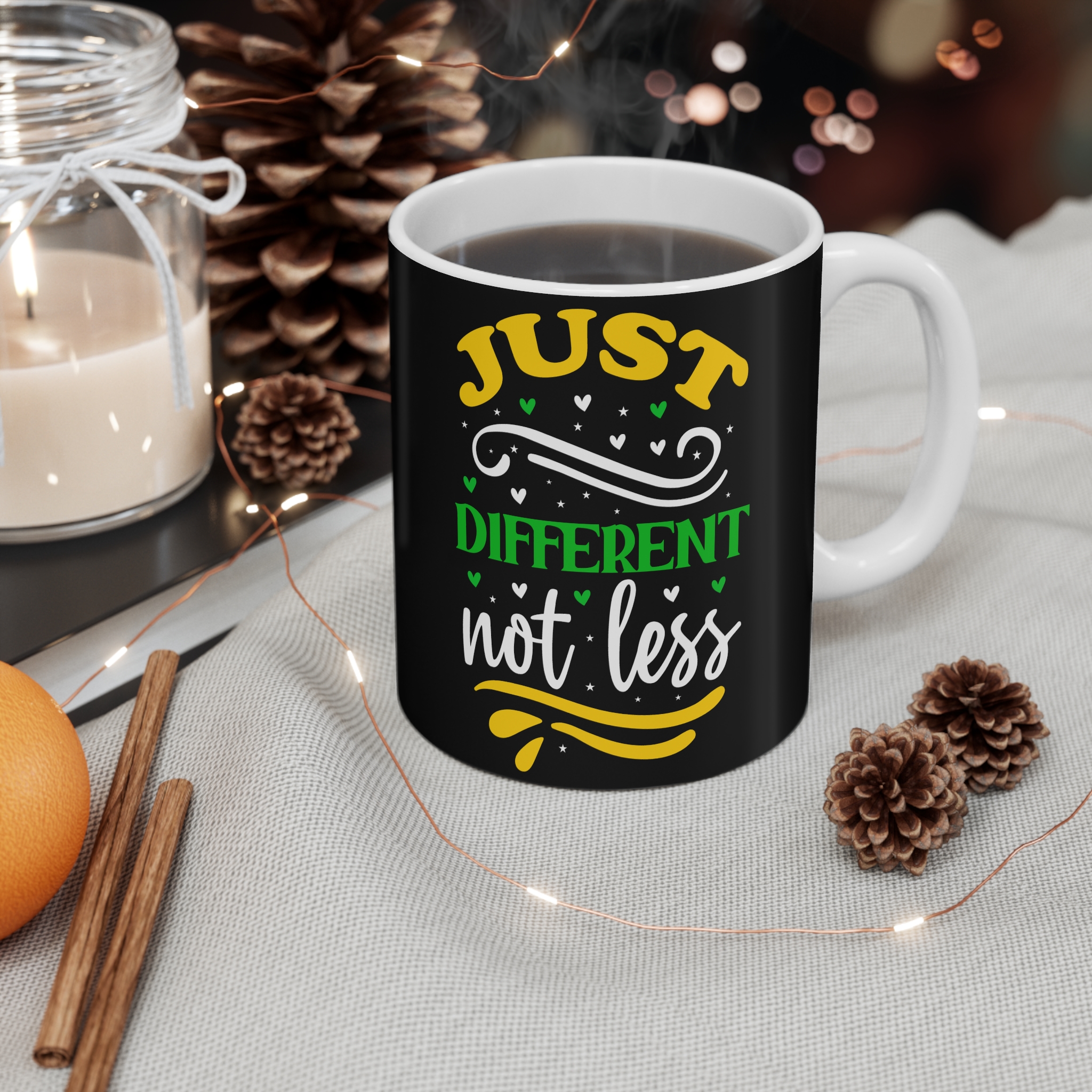 Warm, sturdy, and full of personality — this 11oz white ceramic mug carries a bold, hand-lettered message across a deep black backdrop: “Just different not less.” Every morning pour feels like a quiet act of affirmation. The C-handle fits comfortably whether you’re nursing a slow coffee or grabbing a quick tea between tasks. Smooth, rounded edges and a glossy finish make the colors pop — the yellow, green, and white lettering stands out with cheerful contrast. It holds familiar kitchen staples while also serving as a small, steady reminder of worth and belonging during hectic days, study sessions, or relaxed moments at home.