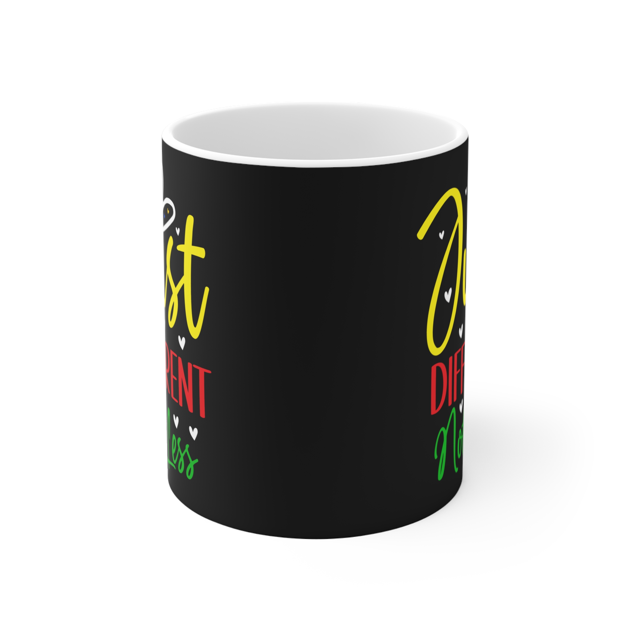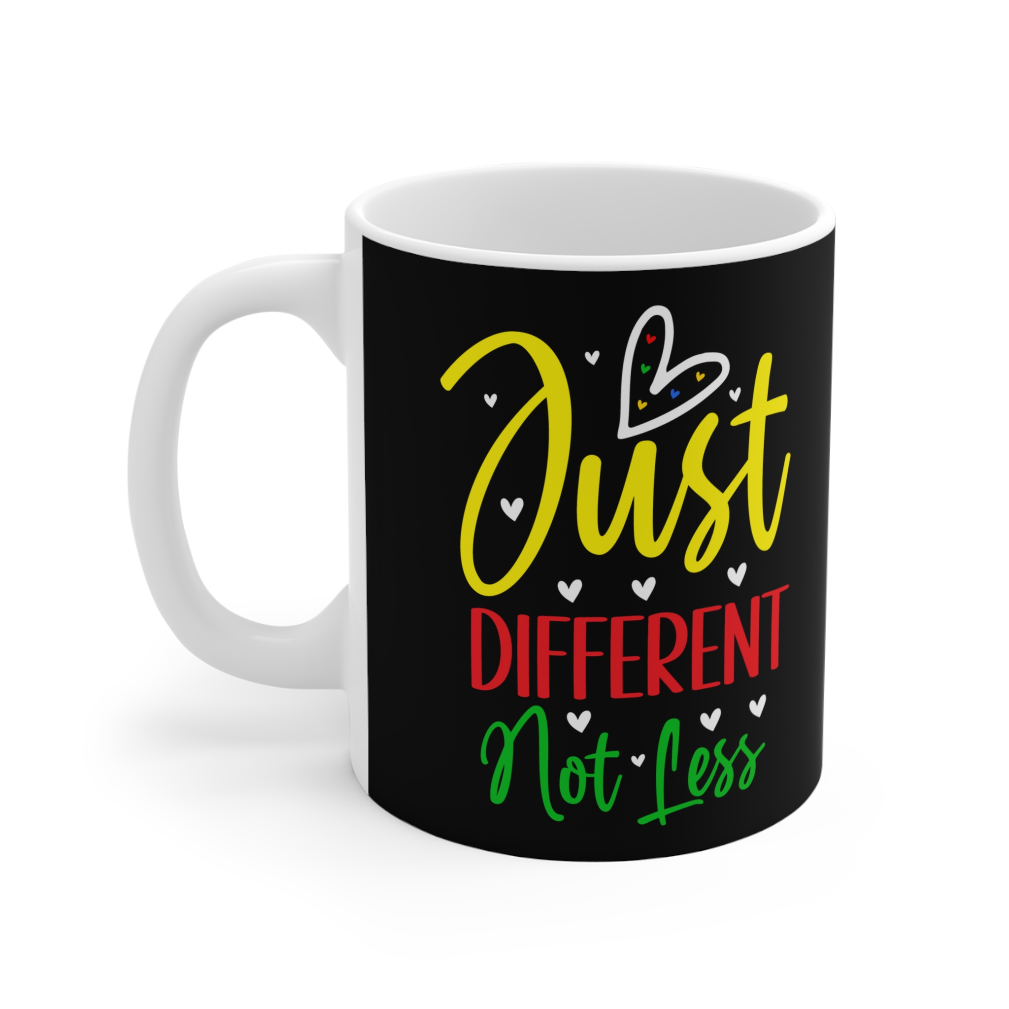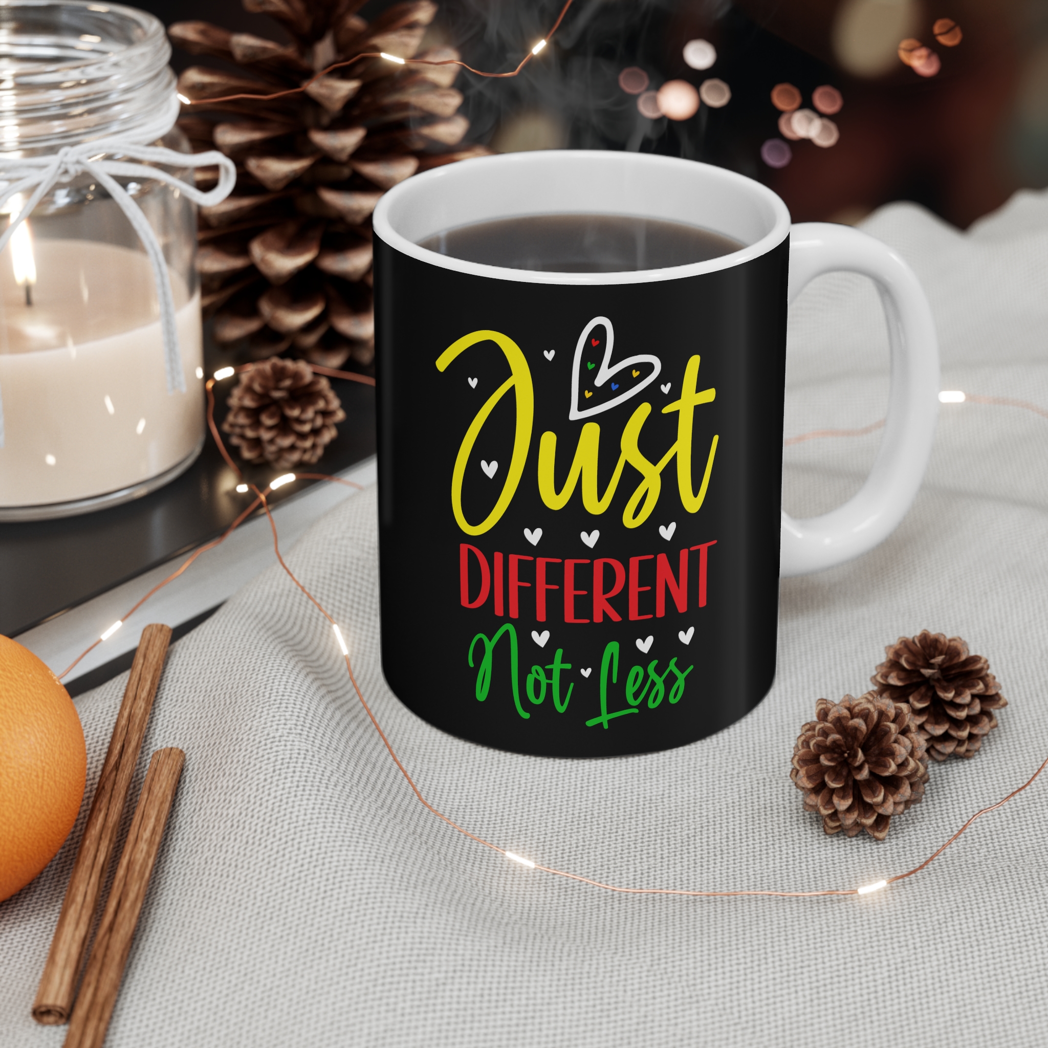 A joyful ceramic mug that celebrates individuality with bold, colorful lettering against a deep black backdrop. The phrase “Just Different Not Less” jumps in sunny yellow, bright red, and vibrant green, surrounded by tiny hearts for a playful, affirming touch. It feels like a quiet pep talk during morning coffee or an encouraging desk companion on a tough afternoon. Lightweight but sturdy, it sits comfortably in hand and adds a confident splash of color to any shelf or workspace.