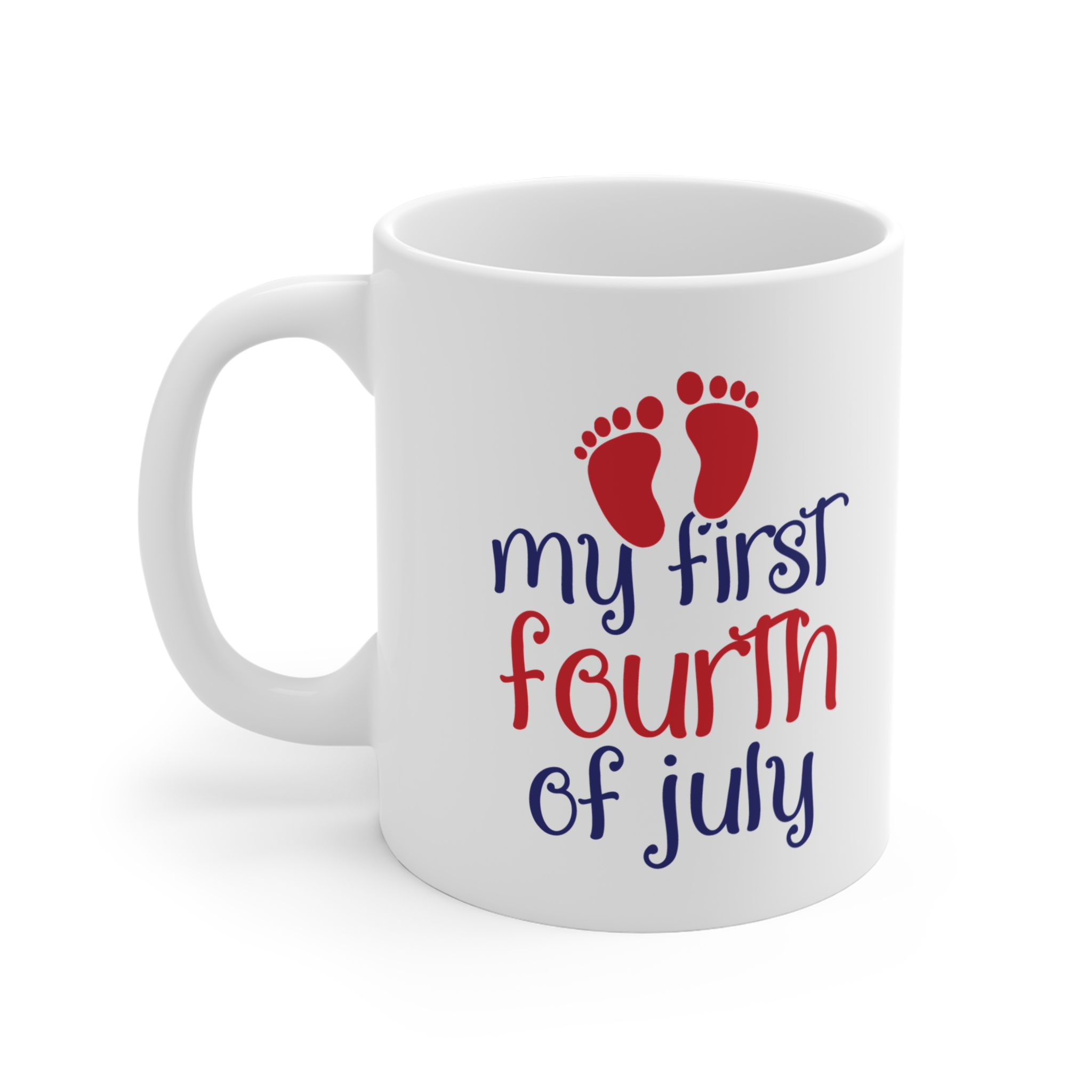 This 11oz white ceramic mug carries a playful, patriotic design tailored for baby’s earliest Independence Day moments. Soft red baby footprints sit above handwritten-style lettering that reads “my first fourth of july,” creating a warm, nostalgic look that feels handmade and personal. Lightweight and comfortable to hold, the mug’s C-handle and rounded shape make it easy to sip from during slow summer mornings. It washes clean in the dishwasher and warms safely in the microwave, so it’s as practical as it is sentimental — a simple keepsake that brings a small celebration to everyday routine and quiet family moments.