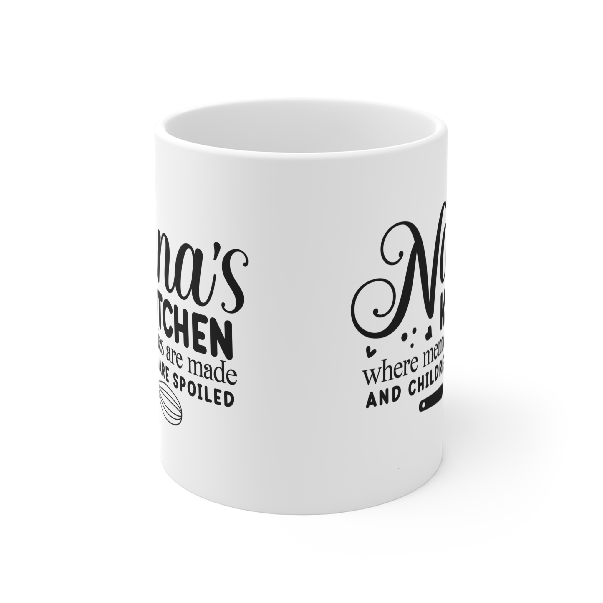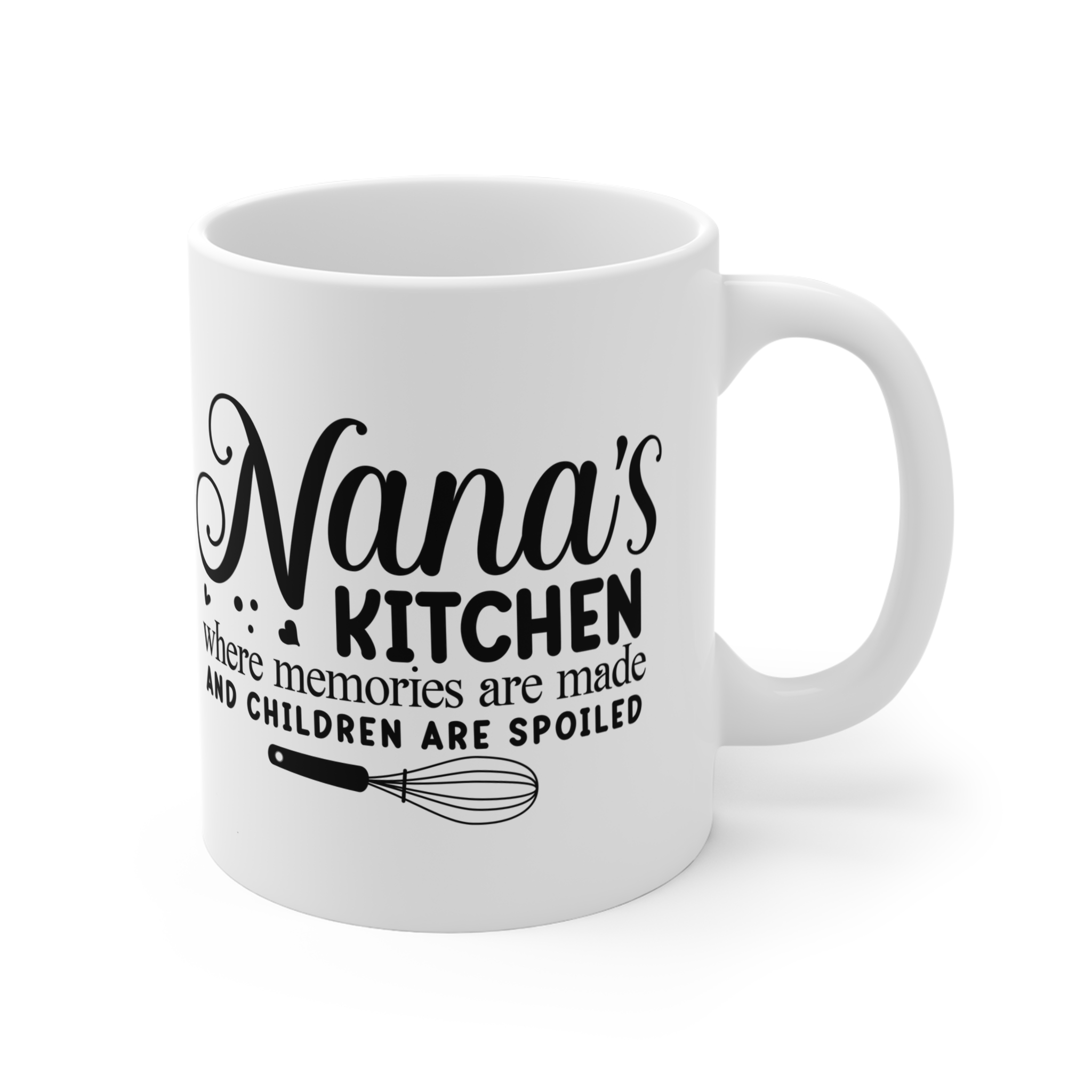 Introducing a charming ceramic mug that evokes warmth and nostalgia. This delightful 11oz mug features the heartwarming phrase, “Nana’s Kitchen, where memories are made and children are spoiled,” making it a perfect addition to anyone’s morning routine. The mug’s design embodies the cozy atmosphere of family gatherings and cherished moments, making it an ideal gift for grandmothers, mothers, and anyone who cherishes their kitchen memories. This mug is perfect for birthdays, Mother’s Day, or simply as a special treat for yourself or a loved one. Whether sipping coffee, tea, or hot cocoa, this mug enhances the experience with its inviting vibe.
